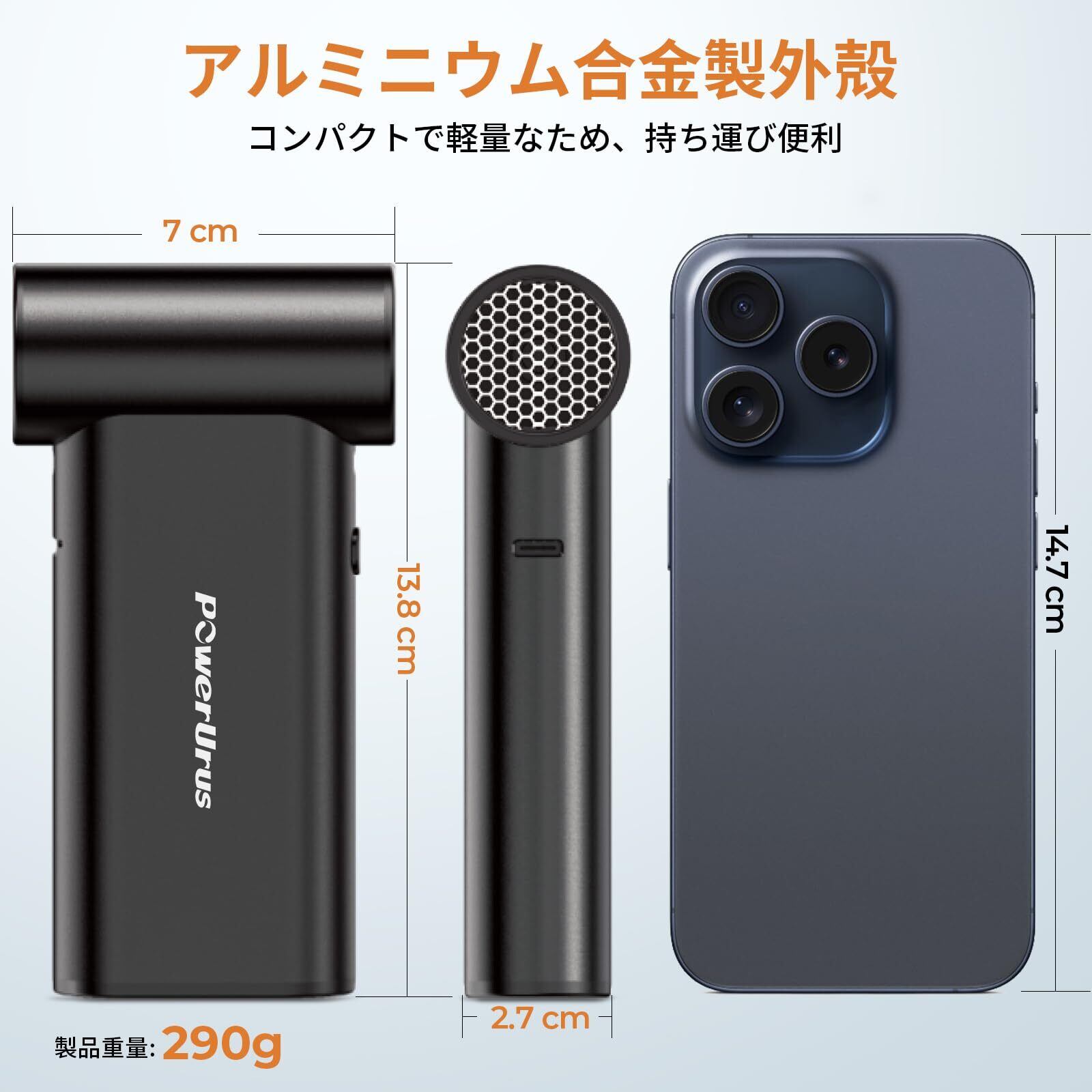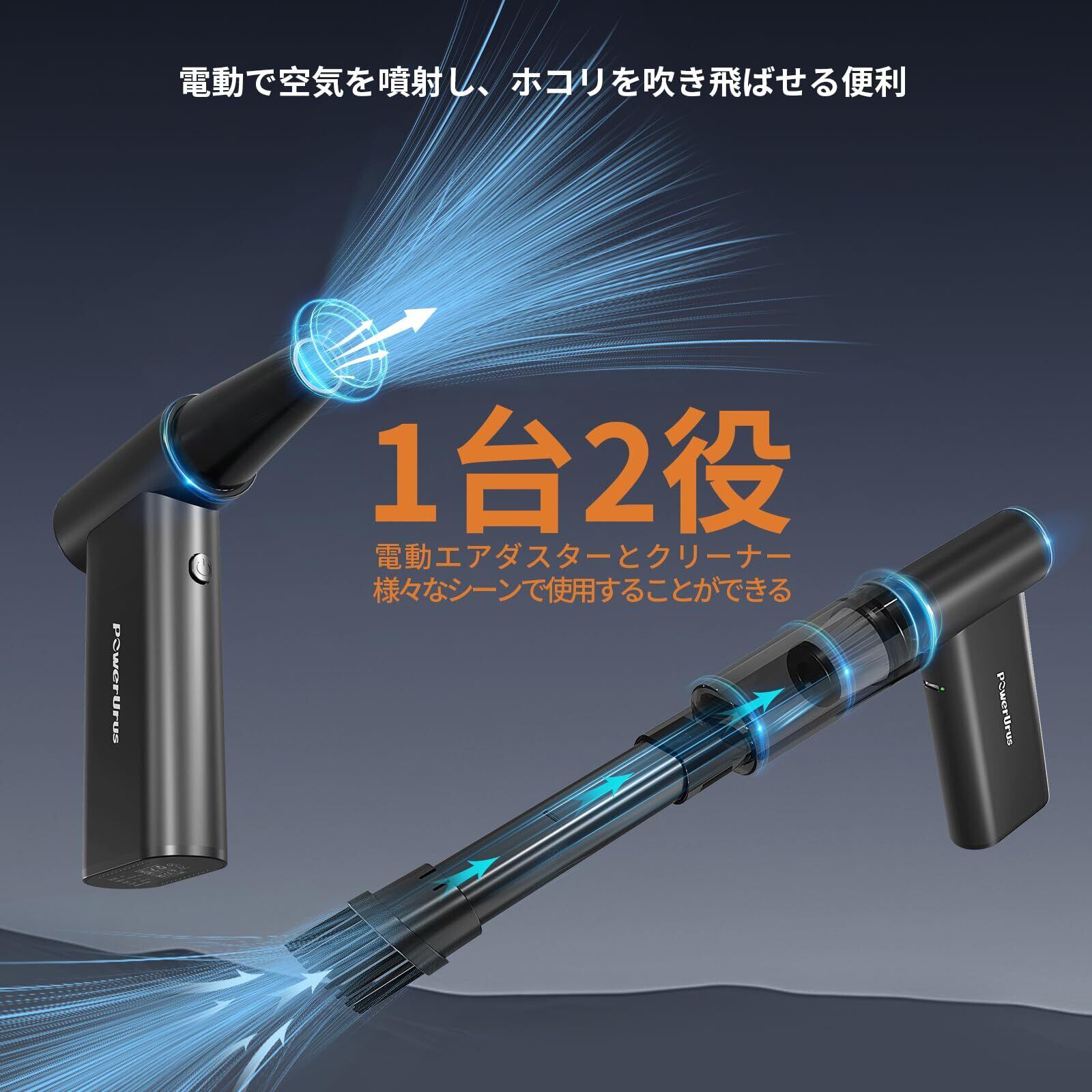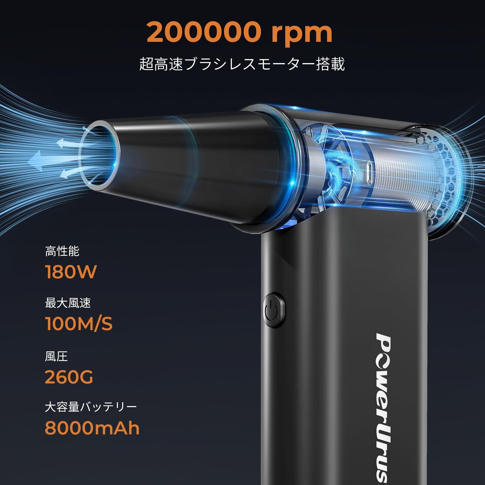 【風速100m/s超高速ブラシレスモーター・ハンディクリーナー】最新のブラシレスモーター技術を採用し、最大200,000RPMの超高速回転を実現。風速100m/s、吹き出し力220gで、ホコリやゴミはもちろん、砂、水、雪まで瞬時に吹き飛ばします。ホウキや掃除機では取り切れない細かい汚れもパワフルな風で一掃。駐車場や玄関、窓のサッシの隙間掃除にも最適です。さらに、車内清掃、キーボードやOA機器、エアコンのフィルター掃除、洗車後の水滴飛ばし、落ち葉の除去など、さまざまな用途に対応。コンパクトながら圧倒的なパワーを備えており、家庭やオフィスはもちろん、アウトドアやガレージでも活躍します。高性能ながら静音設計で、快適に使用可能です。