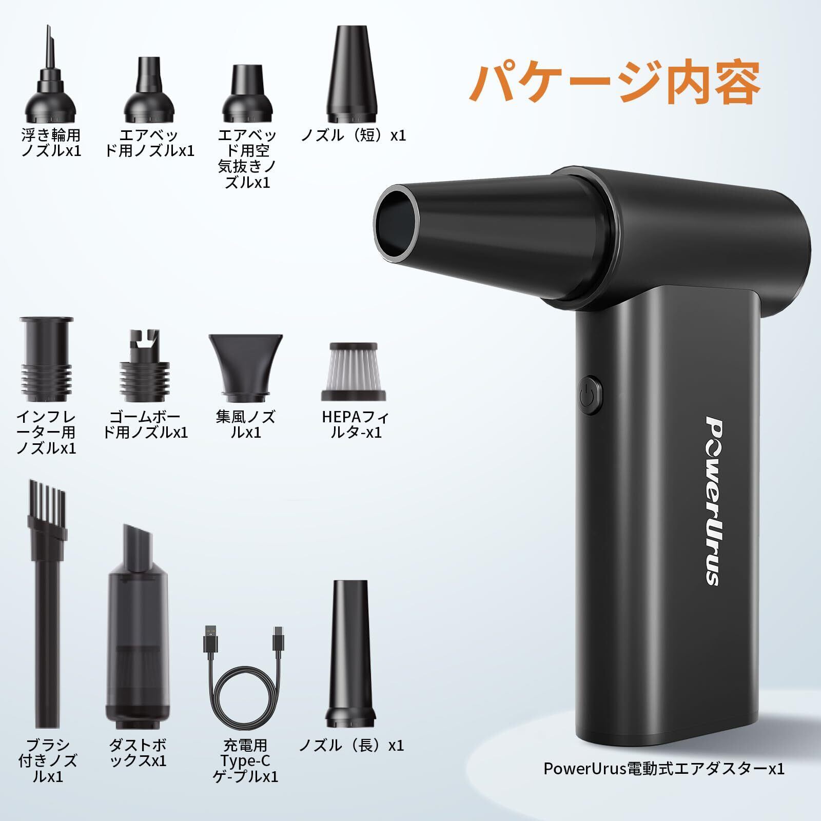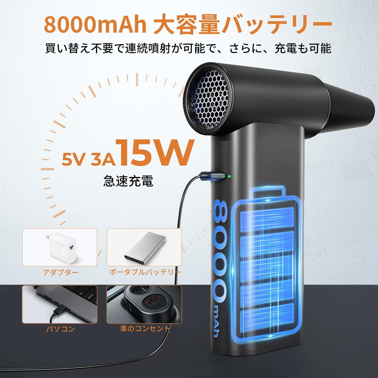エアダスター 電動エアダスター ブロワー 車用掃除機 - 200000RPM高速回転 4段階風量調整 8000mAh大容量バッテリー コードレス アルミ合金 Type-C充電式 小型で軽量 強力 過熱保護 9枚ノズル付き 清潔ブラシ付き 掃除/キーボード/車内/エアコン/洗車用等 日本語取扱説明書付き ブラック