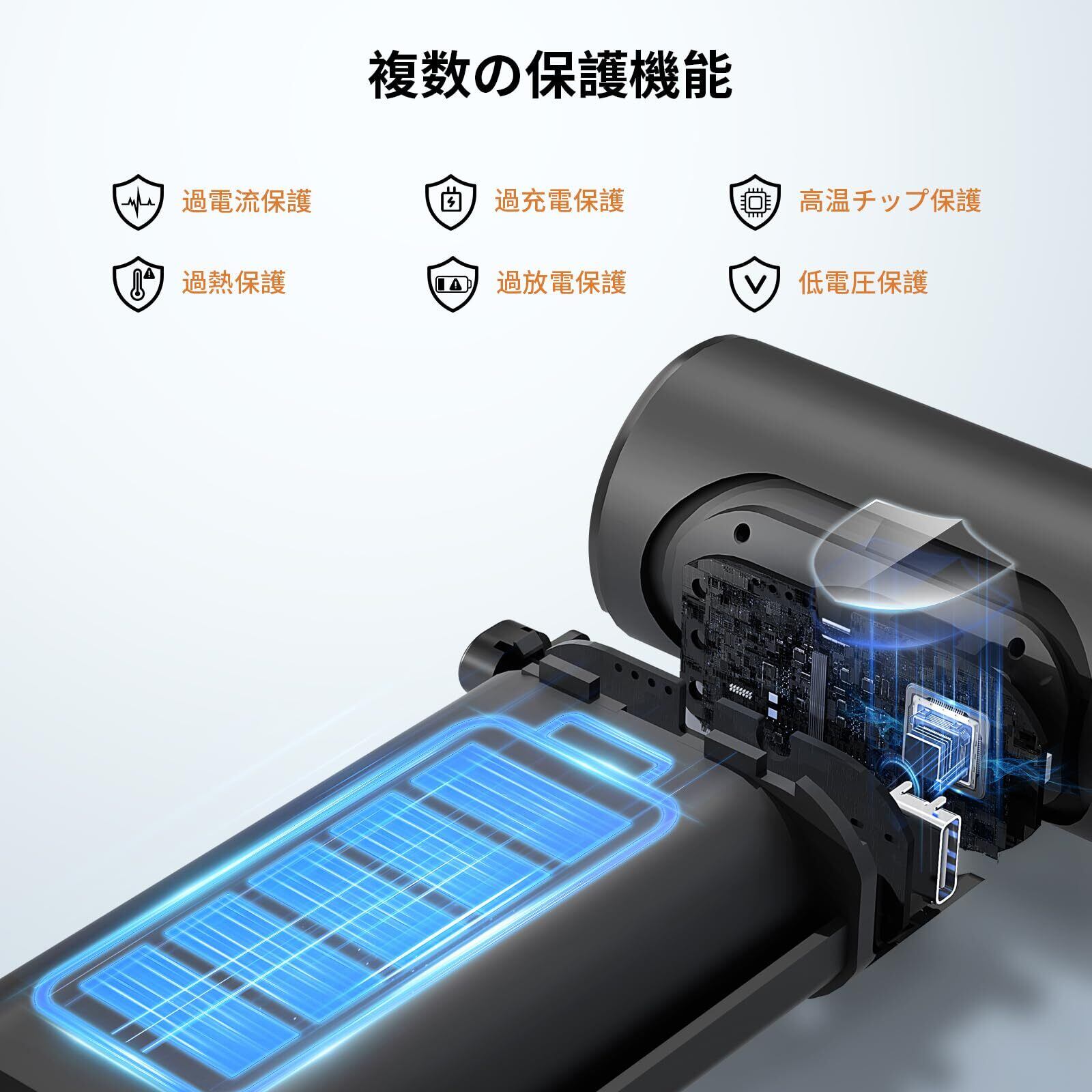 【8000mAh大容量バッテリー・急速充電・コードレス】8000mAhの大容量バッテリーを搭載し、フル充電で最大60分間の連続使用が可能。15W急速充電対応で、約2~3時間でフル充電完了。充電時間を短縮し、使いたいときにすぐ使用できます。電池残量が一目で分かるLEDインジケーター付きで、充電タイミングも把握しやすく、突然のバッテリー切れを防止。コードレス設計なので、電源のない場所でも使用可能。コンセントの位置を気にせず自由に使え、家庭内はもちろん、屋外や車内清掃、オフィス、アウトドアでも大活躍。パワフルな風量と長時間稼働を両立し、日常の掃除をより快適にします。