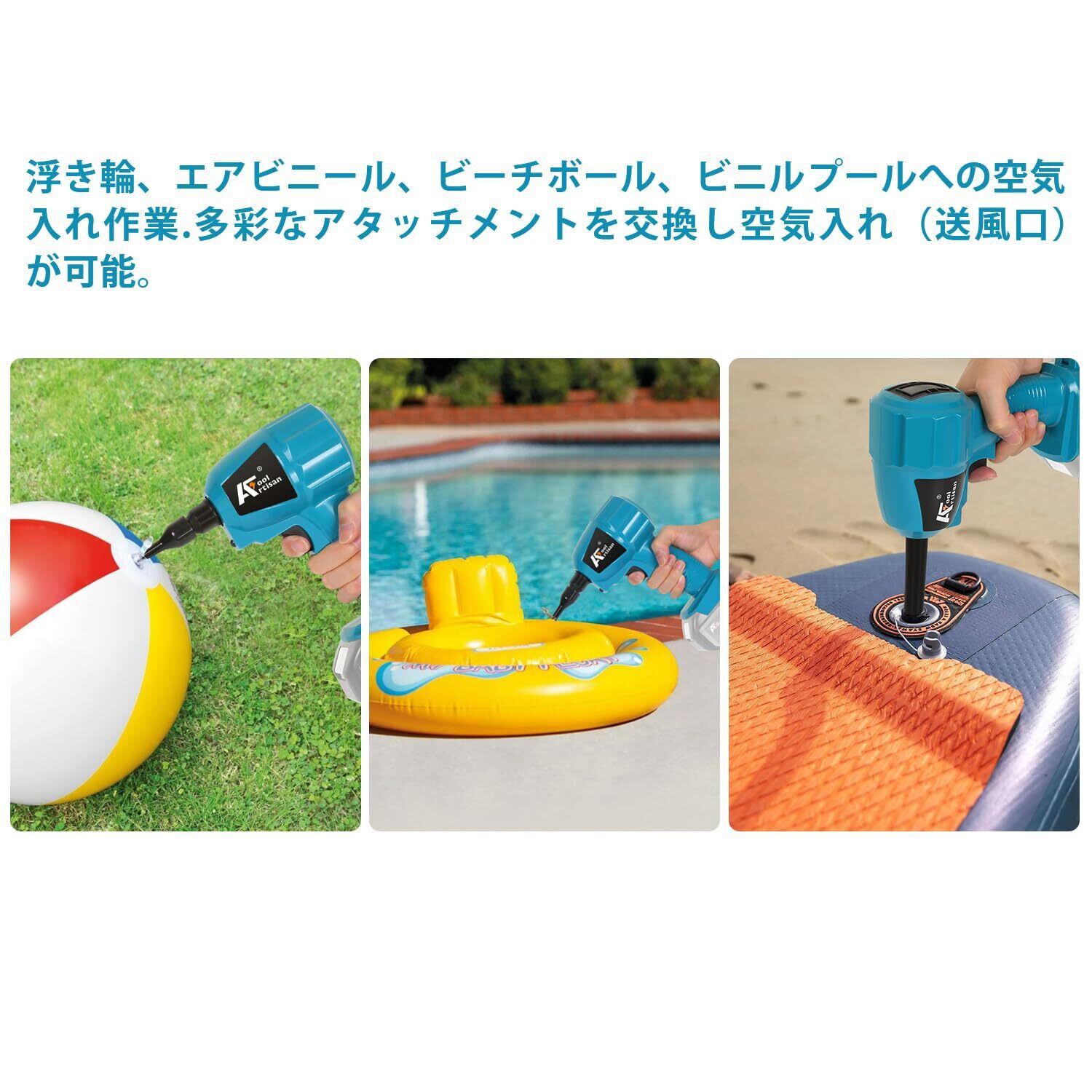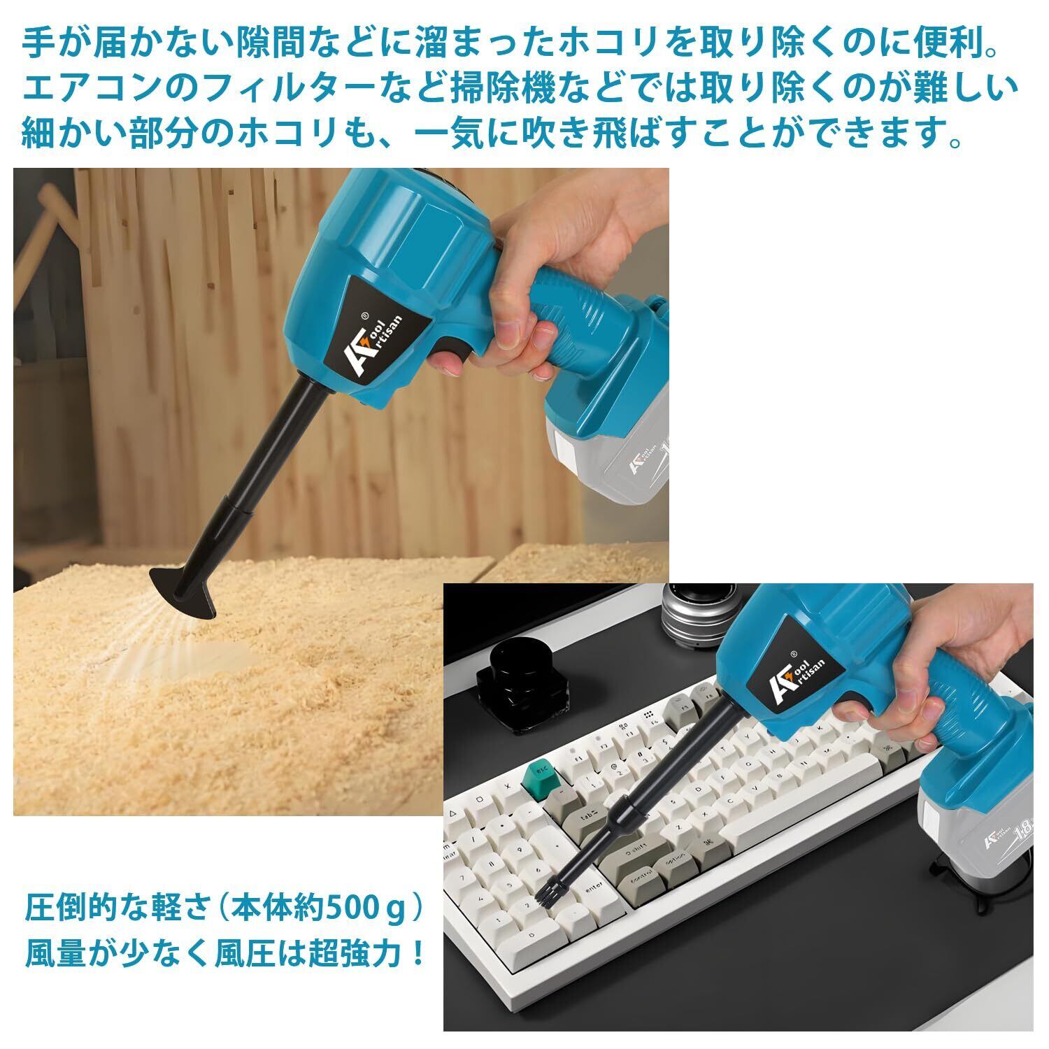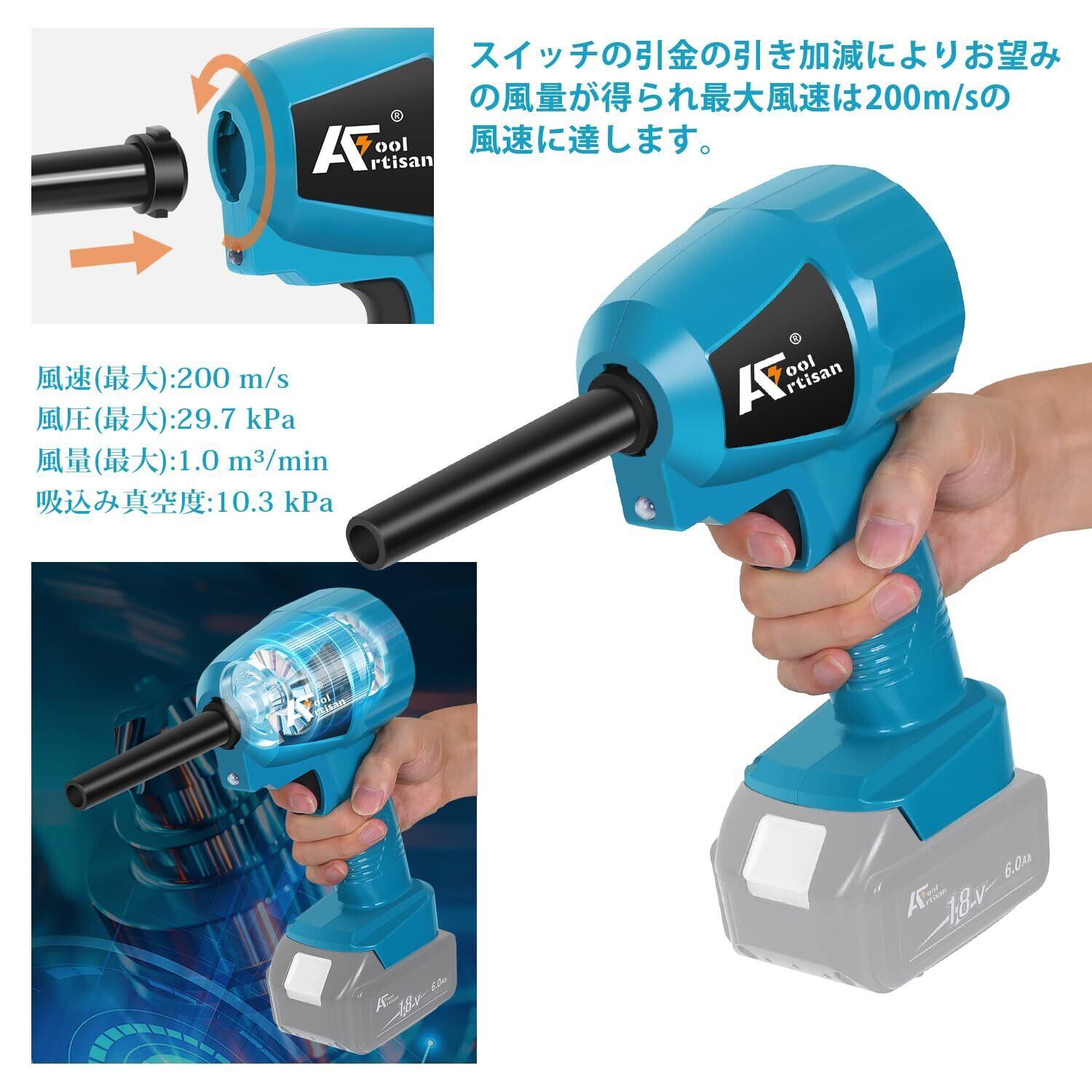 アルチザンツール 【日本ブランド】充電式エアダスター ブルー AT-AD02B 強力吹き飛ばし 空気入れ 空気抜き マキタ互換品 風速(最大):200 m/s 風圧(最大)29.7 kPa PCキーボード、エアコンフィルターのホコリの清掃 洗車の拭き上げ バッテリー別売り
