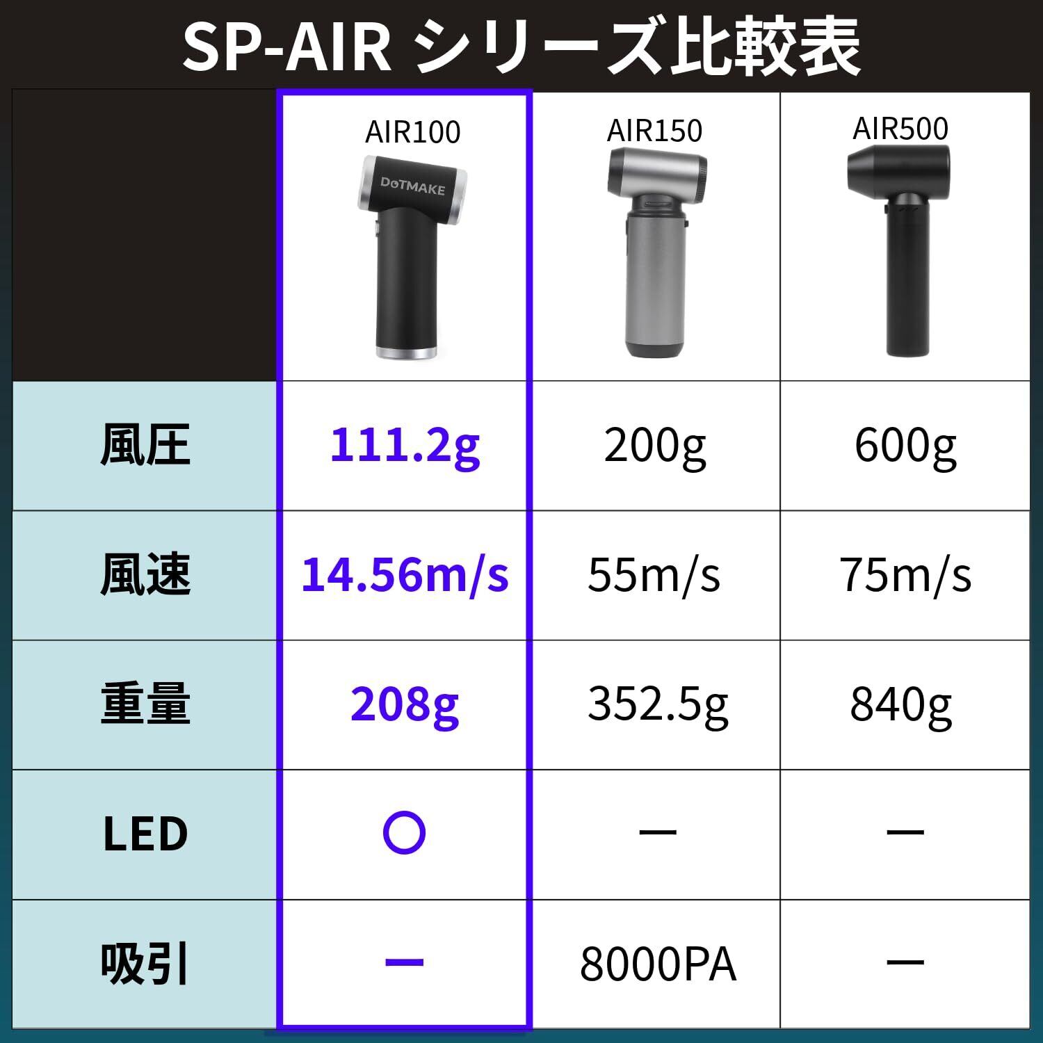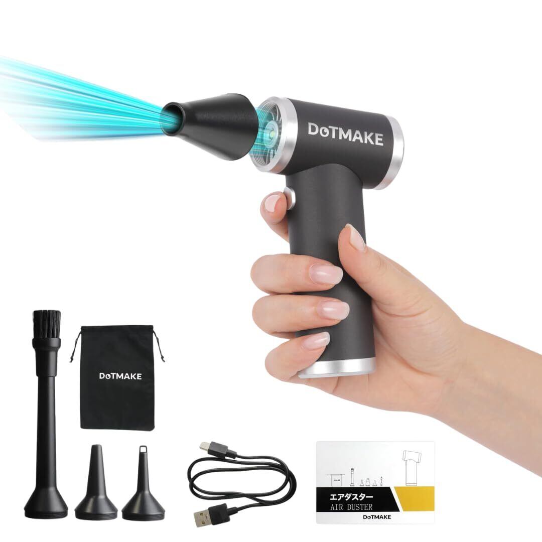 エアダスター 電動エアダスター ブロワー 【日本セラー販売ブランド DOT MAKE】日本国内付き 小型 軽量 208g 5段階風力調整 120,000RPM 4種類ノズル付き USB-C充電式 多用途(PC 掃除/キーボード/車内/洗車/エアコン/花粉 等) 【収納ポーチ付き】 SP-AIR100