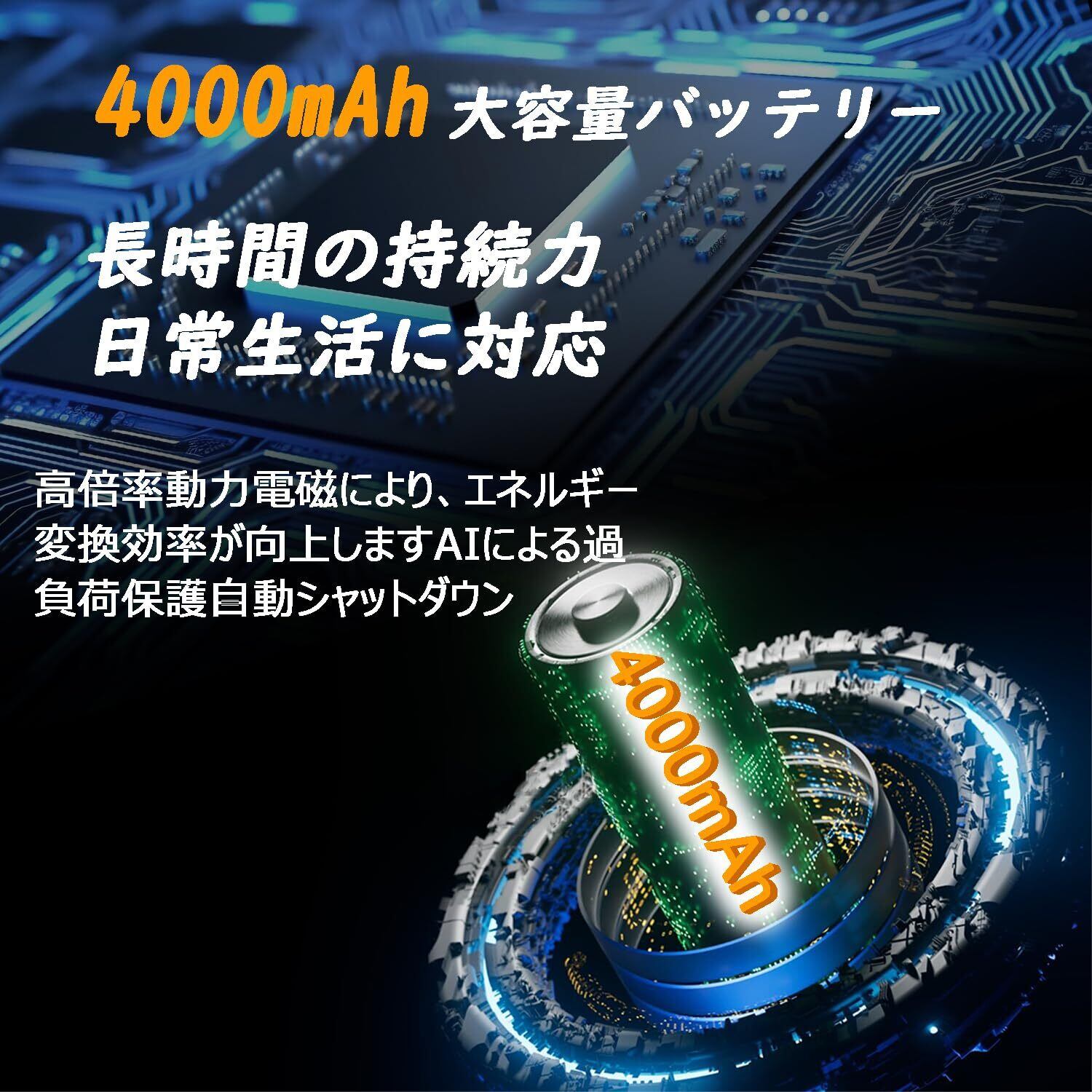 【4000mAh大容量バッテリー】フル充電しなら、最大約120分で使用できます。同時に温度過熱保護を提供して、温度が高すぎると自働的に働作を停止して、温度が高すぎることによる危険を防止します。