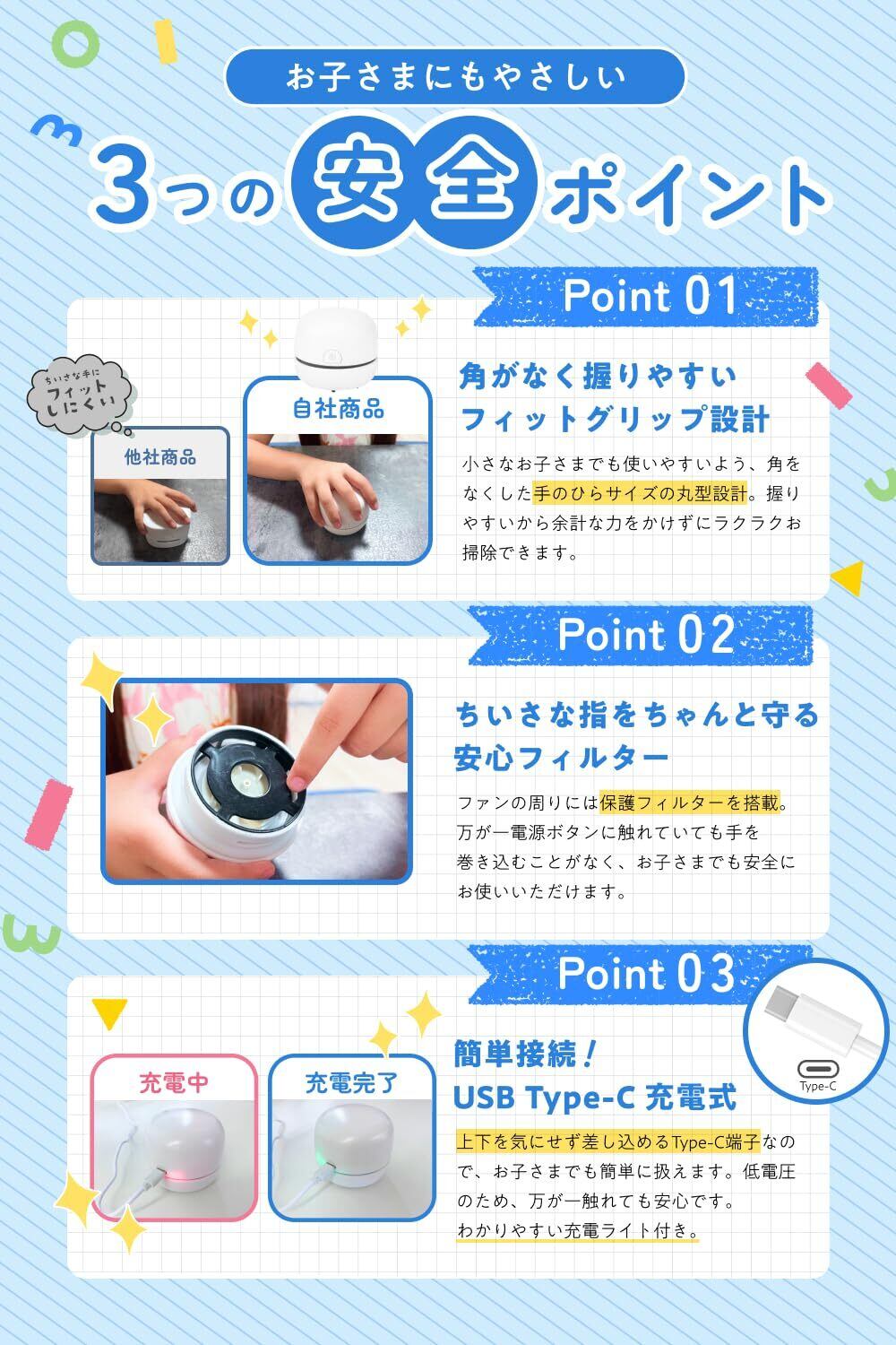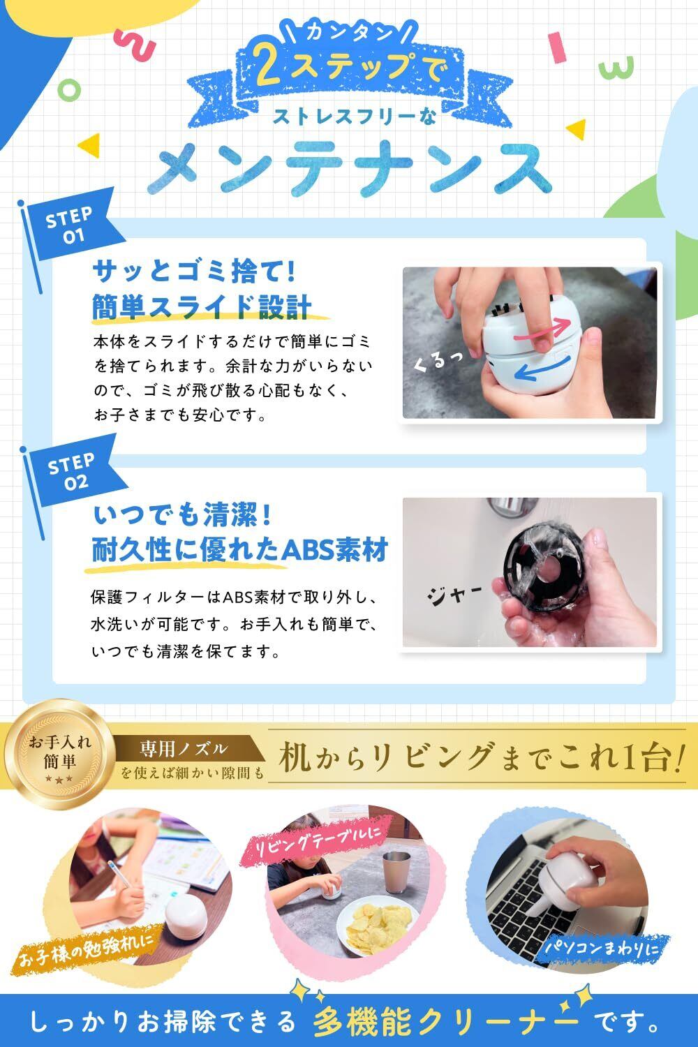 【学習塾導入 ガードフィルター搭載モデル】 充電式卓上クリーナー [ターボ吸引×ワンプッシュ操作でゴミを逃さず簡単お掃除] 消しカスクリーナー ミニデスク掃除機 (ホワイト)