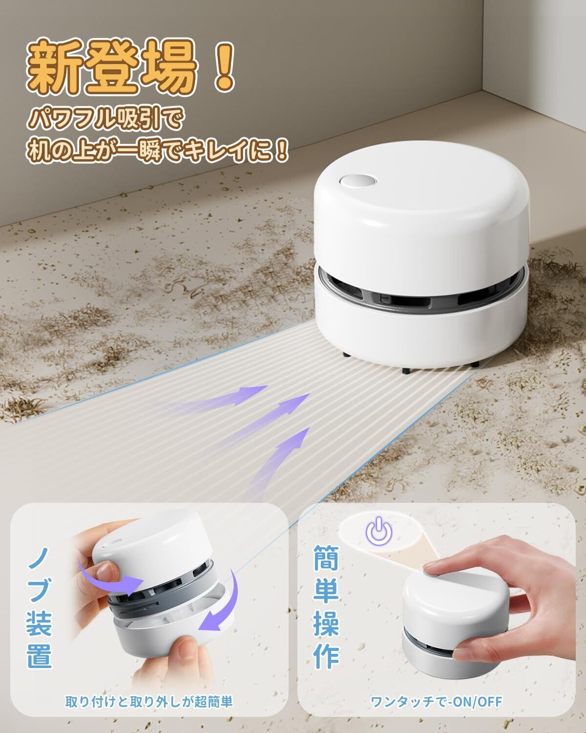 【コンパクトで多彩なシーンに活躍】本体は約80mmとリンゴよりコンパクト。片手で簡単操作で、バッグや机の引き出しにすっきり収納可能。消しゴムくず、鉛筆の削りかす、紙くず、お菓子の食べこぼし、ほこり、ガンダム模型の樹脂片まで、さっと吸引完了!ご購入・ご利用でお困りの際は、お気軽にお問い合わせください。心を込めてご対応させていただきます。