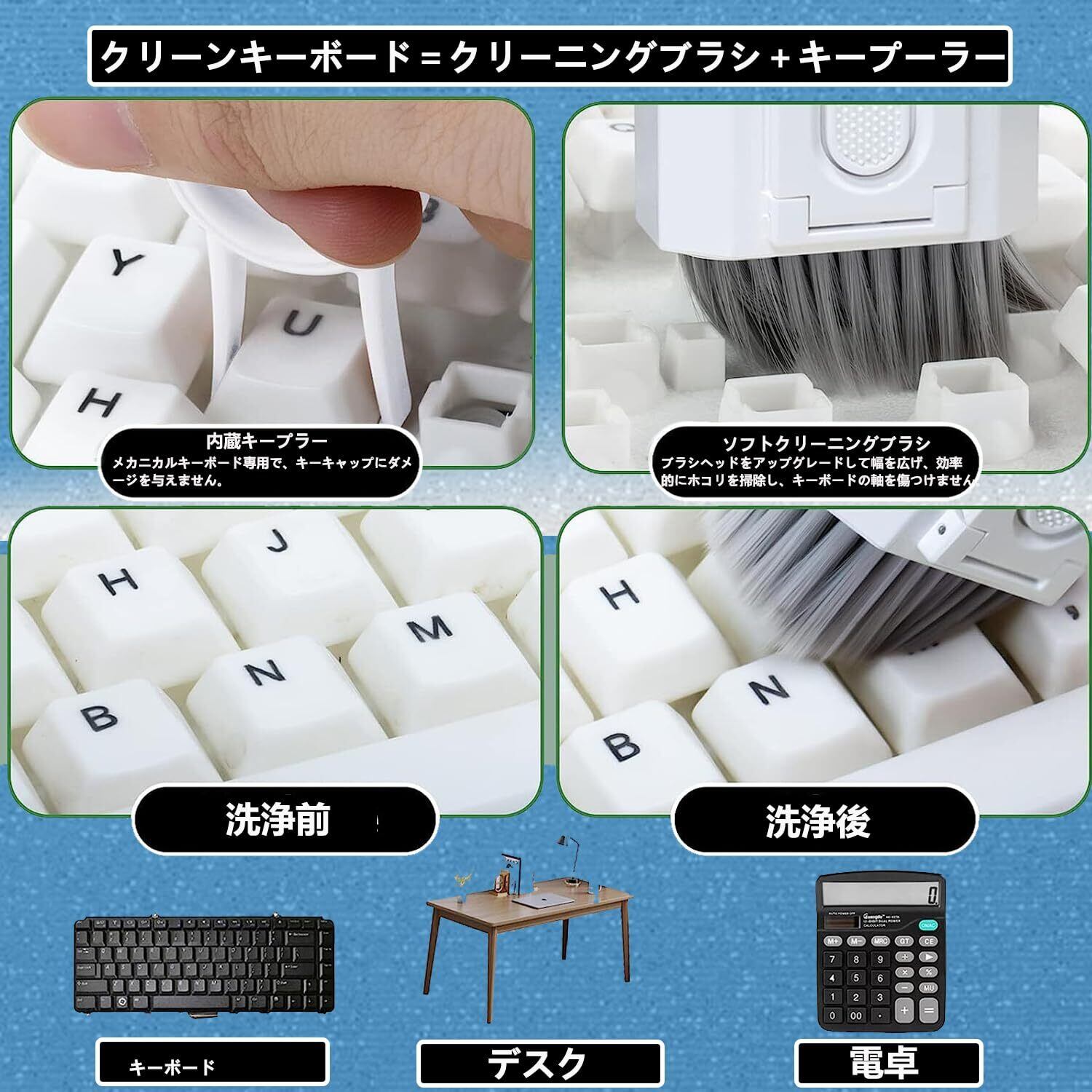 【キーボードクリーニング】 キーボードに食べ物やゴミなどがよく落ち、普段はなかなか掃除できないでしょう。クリーニングキットのキーキャッププーラーで簡単にキーキャップを引き抜くことができるので、高密度ブラシ快適にキーボードを掃除できます。 (注: キーキャップ バックルはメカニカル キーボードにのみ適合します)。格納式の中程度のソフトおよびハード ブラシは、ラップトップやキーボードに使用できます。ミニ高密度ブラシは、ラップトップのキー間の隙間を深く掃除するのに最適です。金属製のピンの先端は、ノートパソコンの隙間の汚れをやさしく取り除くことができます。 プレミアム クリーニング キットには、キーボード表面から指紋やその他の埋め込まれた汚れを効果的にクリーニングするために必要なすべてのツールが含まれています。