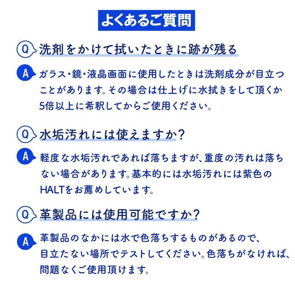 ウエス(布)・マイクロファイバークロス・ティッシュペーパーで噴霧して拭き取ったら終了。水洗い不要 ①クリーナーのヌメリが無い②静電気が起きない③薄い皮膜が形成され汚れにくく、錆びにくくなる。 洗剤成分が残留・乾燥した方が良く再汚染が無い。 布製のソファー・カーペット・椅子の場合は、噴霧後叩いて汚れをウエス等に付着させる ・黄色ブドウ球菌も不活化・死滅