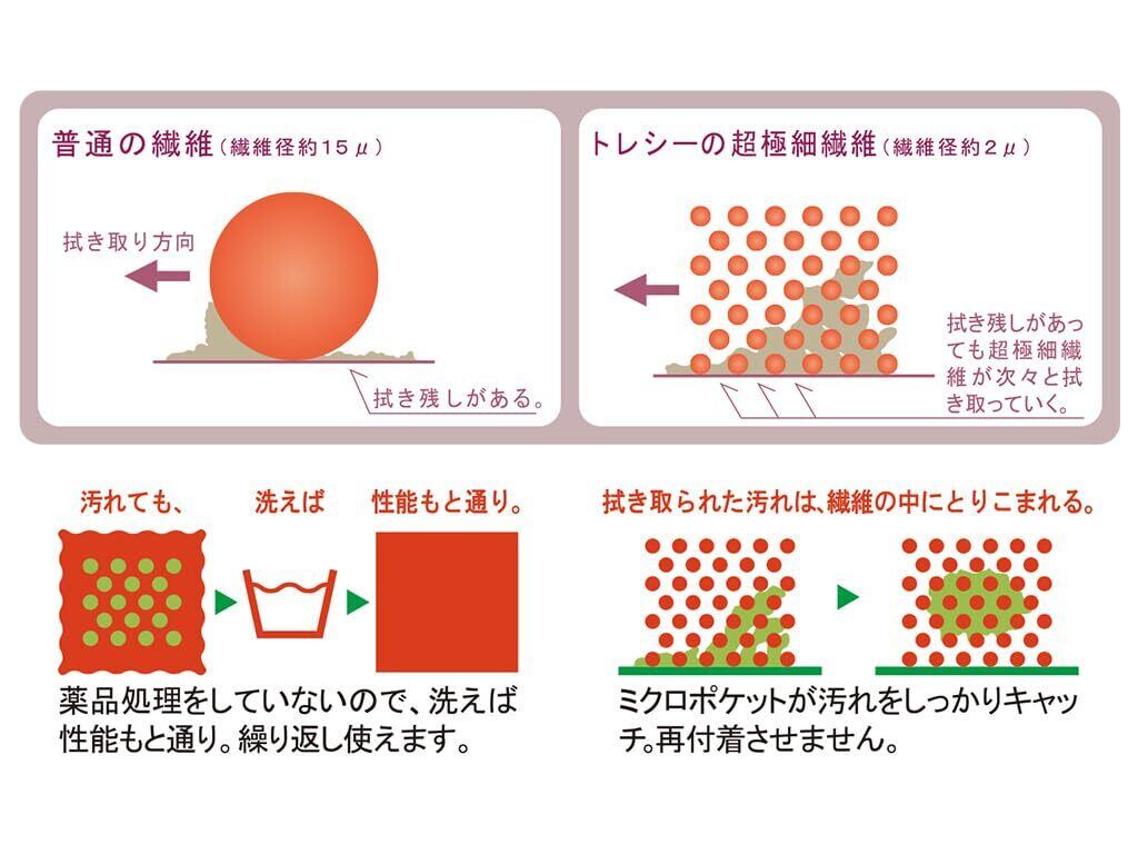 ●直径約2ミクロンの超極細繊維が拭き取りにくい汚れの中に入り込み、きれいに拭き取ります。