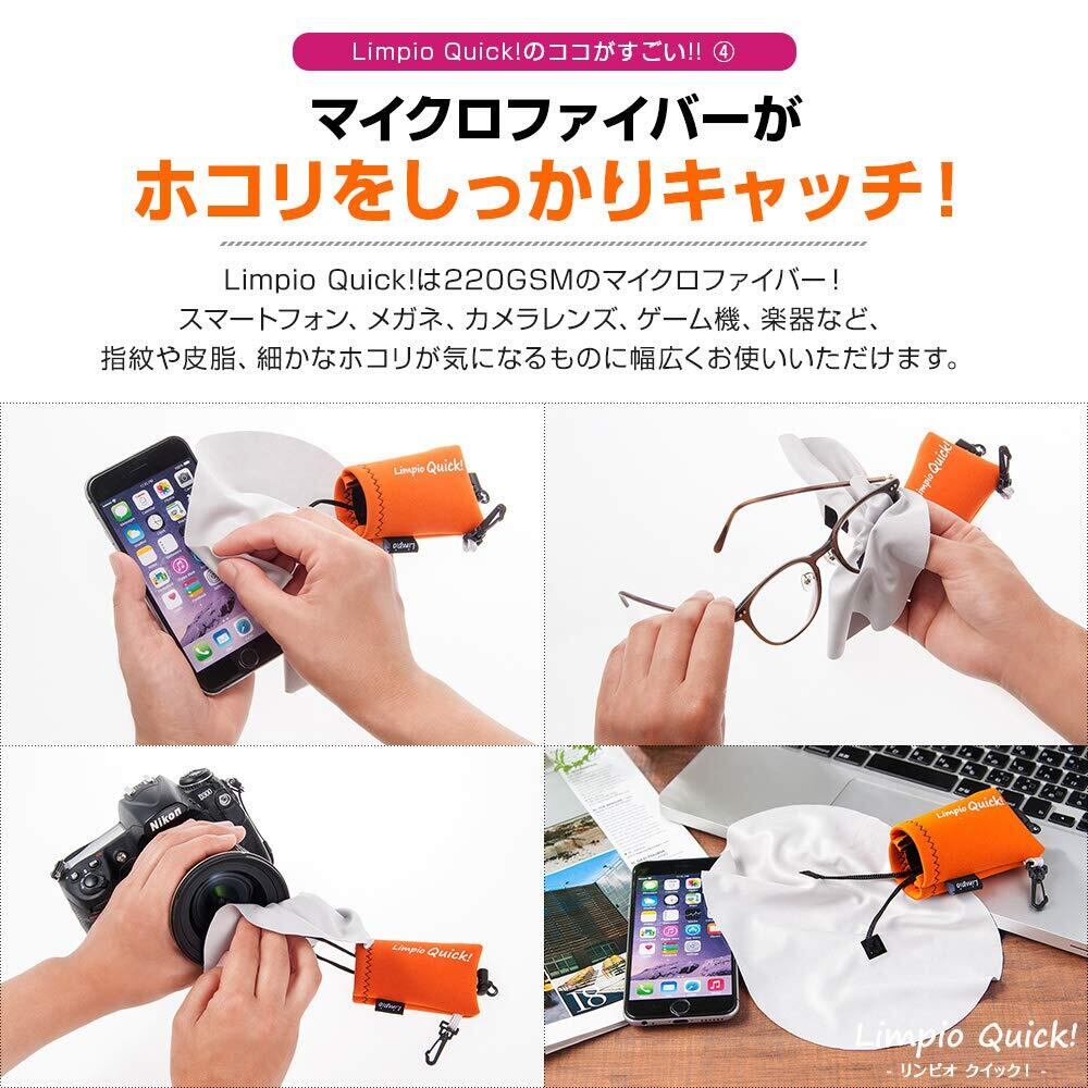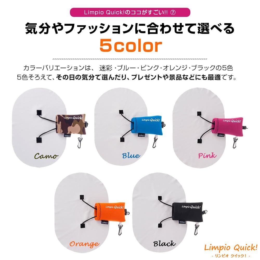 【 カラーバリエーション & 耐久性 】Limpio Quick!は、オレンジ、ピンク、ブラック、ブルー、迷彩の5色から選べるおしゃれなデザイン。ネオプレン製ポーチは汚れが付きにくく、クロスは水洗い可能なので繰り返し使用できます。※迷彩柄(カモフラージュ)は制作時生地カットの仕方で模様が変わります。【Designed in Japan】