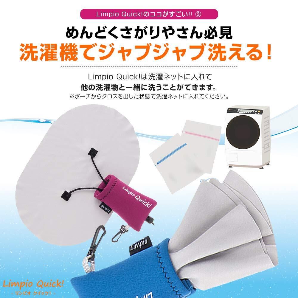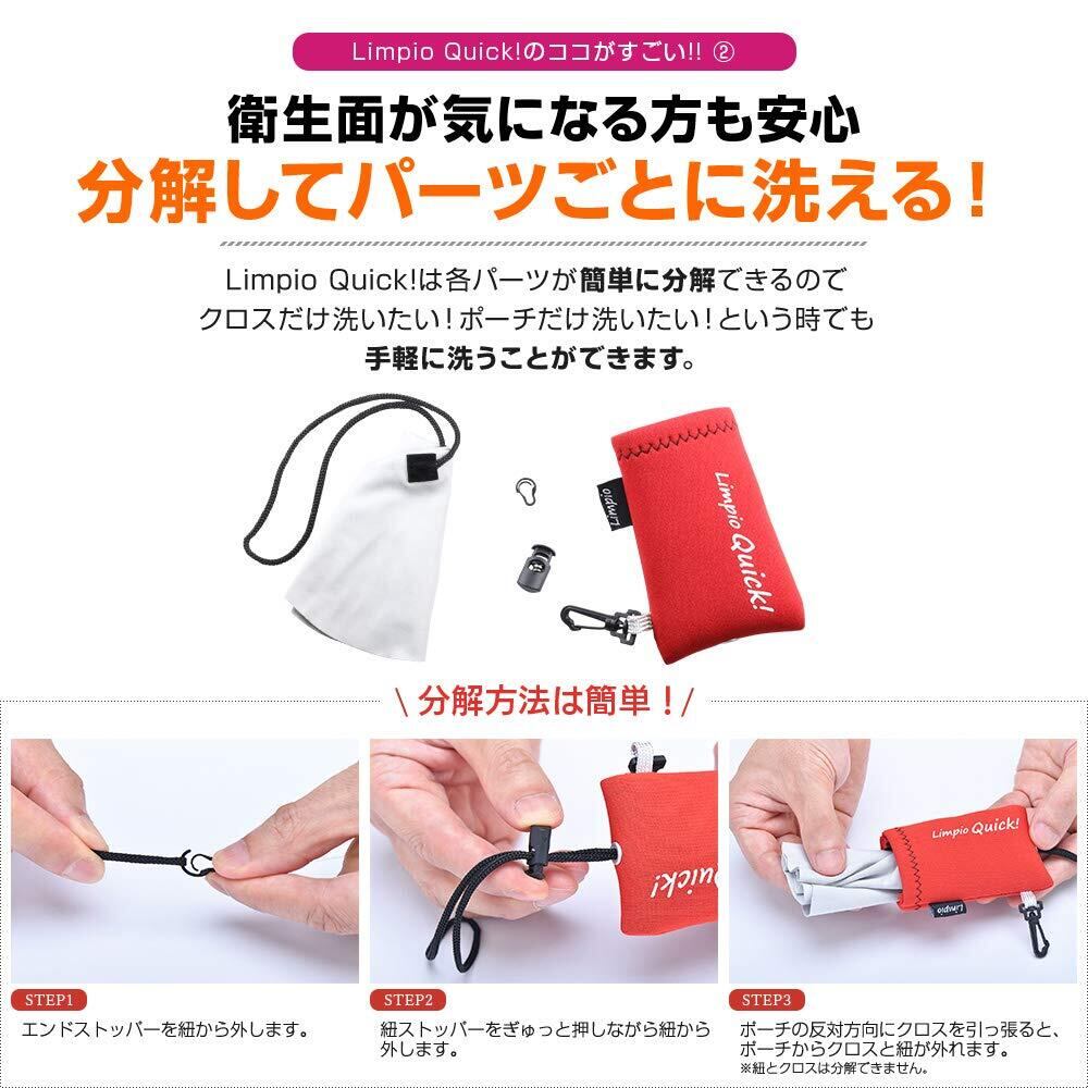 【 意匠登録 & 簡単収納 】Limpio Quick!(リンピオ クイック)は、意匠登録第1671575号を取得した、デザインと機能性が際立つ革新的な商品です。実用性を追求した結果、お客様の「ポーチにクロスが収納しにくい」というお悩みに応えるため、”紐を引くだけ”でクロスを手軽に収納できる独自の仕組みを採用。面倒な畳む作業の手間を無くし、ワンアクションで収納できるようになりました。また、軽量設計により、男女問わず快適にお使いいただけます。