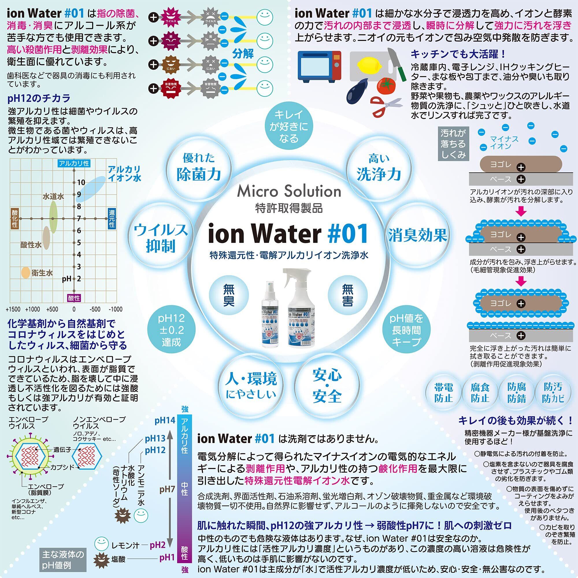 除菌・消臭効果・"ion Water #01" は専門研究機関など第三者機関の検証を受け、除菌効果をはじめ、数々の効果が立証されました。また、においの元をイオンで包み空気中発散を防ぎます。MADE IN JAPAN by Micro Solution・製品の詳細は Micro Solution Website でご確認ください。