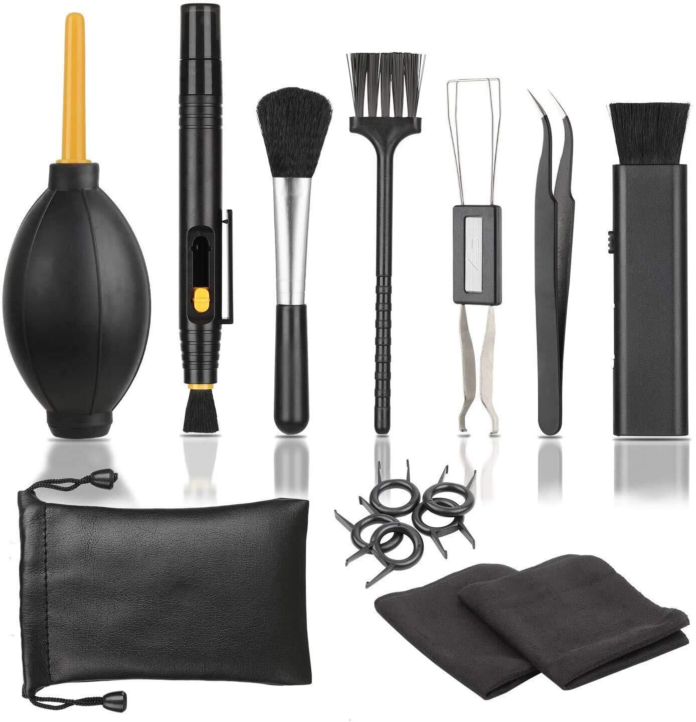 【セット内容〡10点セット】カメラのレンズをクリーニングする際に便利なクリーニング用品8点セット:①1×デュアルユースキーボードボタン抽出ツール、②1×エアーブロワー、③1×液体スプレーボトル(クリーナ液が別売り)、④1×ピンセット、⑤1×レンズブラシ、⑥1×ダストブラシ⑦2×マイクロファイバークリーニングクロス、⑧5×引き抜き工具⑨折りたたみ式ブラシ、⑩収納袋