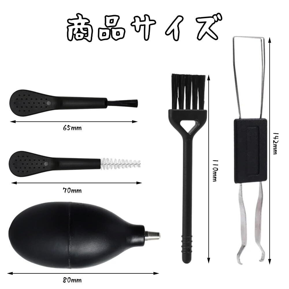 1.【キーボードクリーニングセット】汚れのないキーボードにするための理想的なセットです。2xミニブラシ、1xレギュラーサイズクリーニングブラシ、1xキーボードキャップリムーバー、1xブロアーが付属しています。このセットは、デジタル一眼レフカメラのスクリーンやレンズ、スマートフォンのスクリーン、その他のデリケートな表面のクリーニングにも使用できます。 2.【耐久性のある送風機】送風機は電池も補充も必要ありません。キーボードやカメラレンズの汚れやホコリを吹き飛ばすために、的確に狙った空気の流れを当てることができます。ブロワーは絞りやすく、デリケートな表面から小さな粒子を取り除くことができます。 3.【3種類のブラシ】このセットには3種類のブラシがあり、どちらも丈夫で柔らかい毛を持っています。ミニブラシは繊維が細いので、キーボードなどの小さな隙間に届くように設計されています。大きい方のクリーニングブラシは、カメラレンズの敏感な部分のホコリや、キーボードの届きにくい部分の小さなパンくずを効果的に取り除くことができます。 4.【キーキャップ取外し機】キーボードキャッププラーのワイヤーは、すべてのキーに合うように外側に曲げることができます。ほとんどのメカニカルキーボードと互換性があります。スペースキーを除くすべてのキーに対応します。 5.【幅広い用途】パソコンの掃除/キーボードの掃除/ノートパソコンの掃除/メカニカルキーボードの掃除/カメラの掃除/電話の掃除/電子機器の掃除。