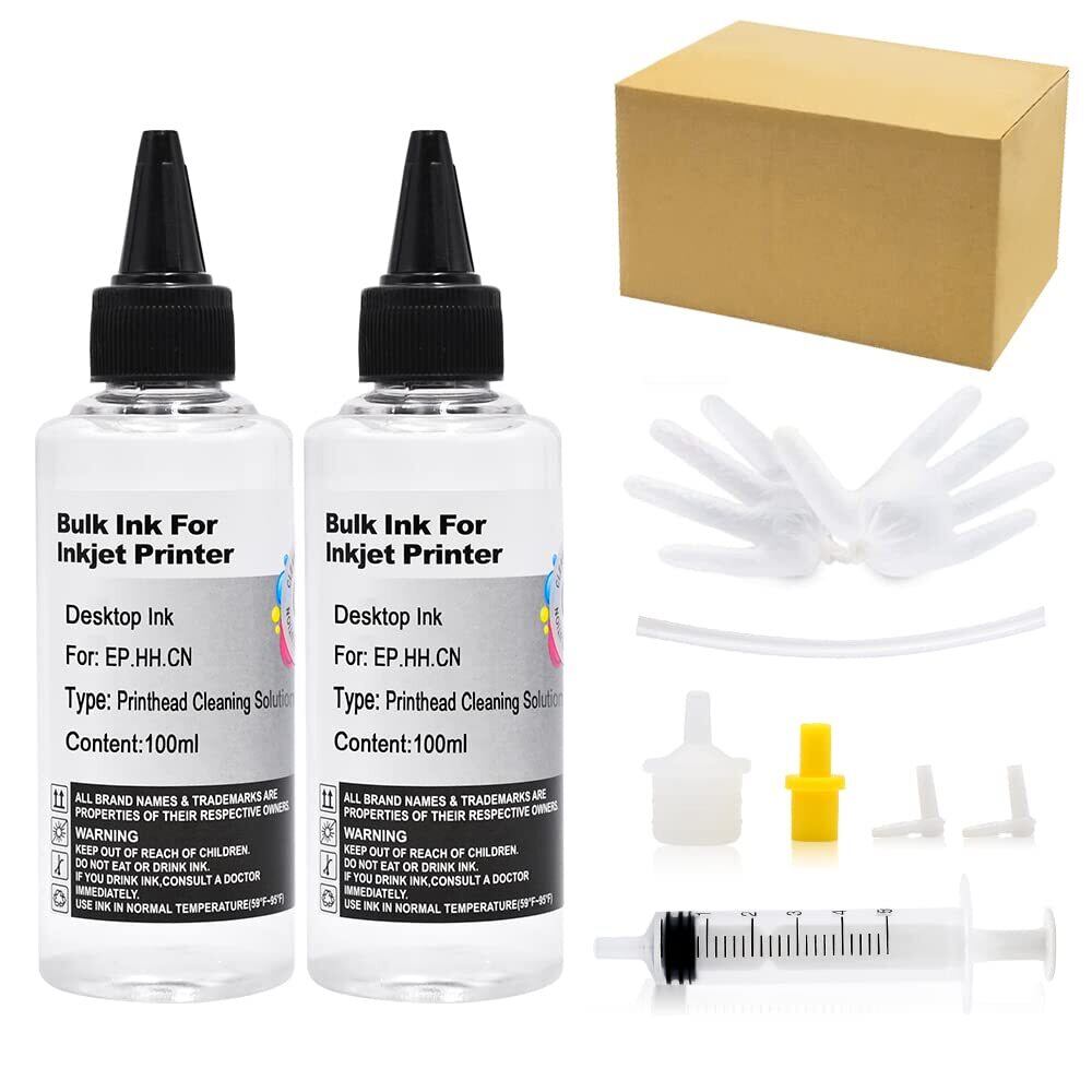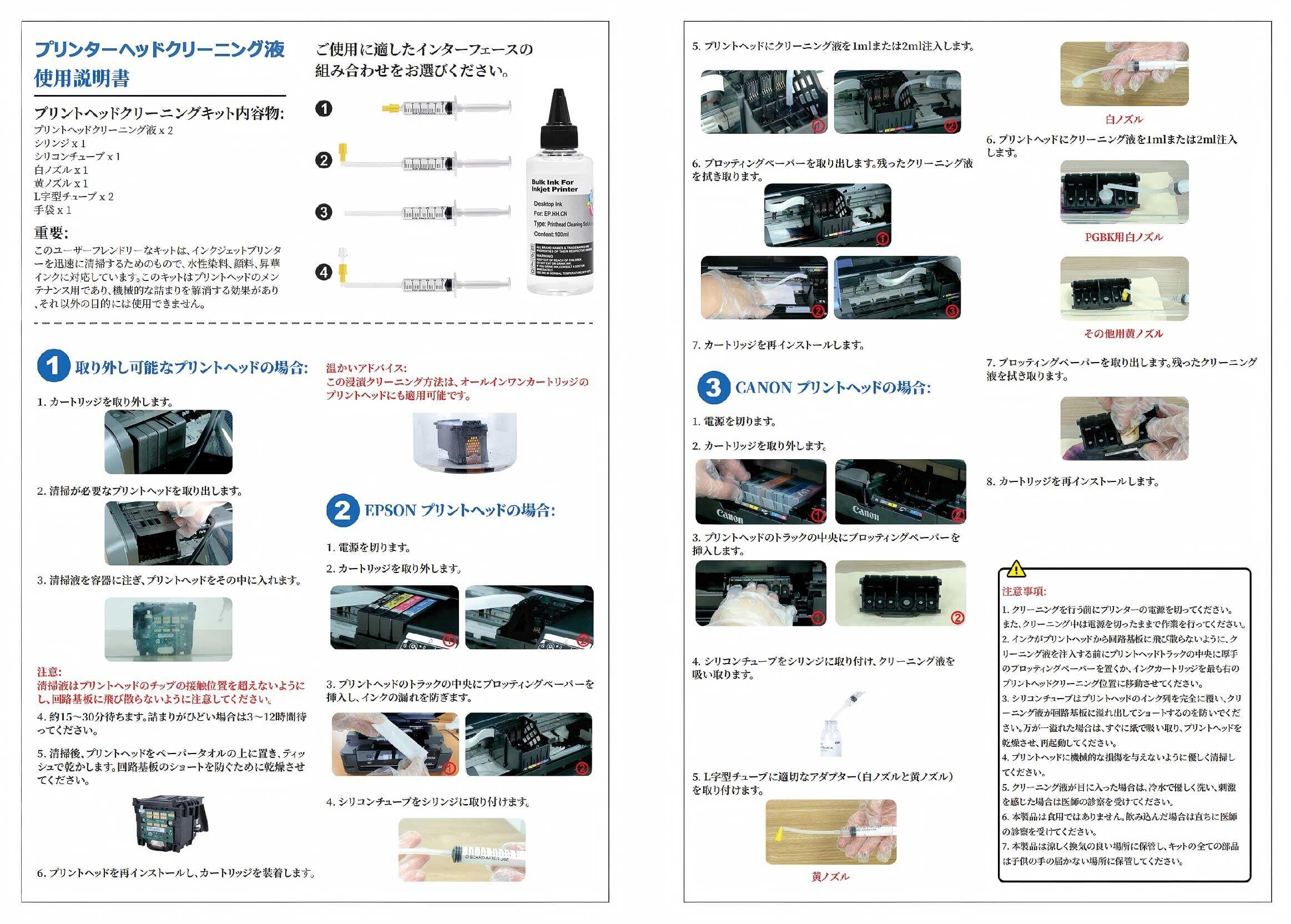 【セット内容】 100mlのプリンターヘッドクリーニング液2本、5mlの注射器1本、シリコンチューブ1本、プリンターへのインク注入用アダプター4個、手袋1組