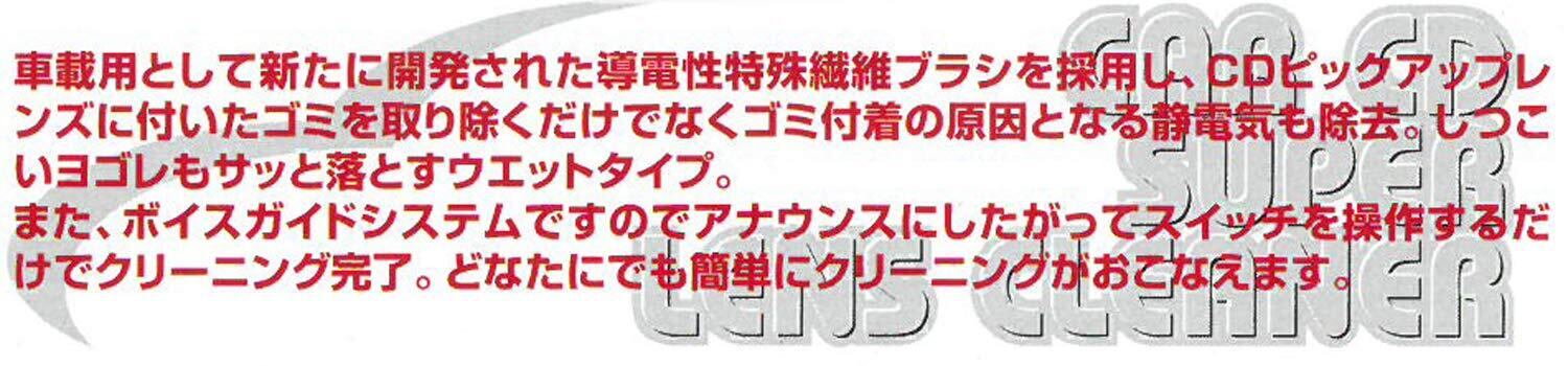 ・車載用として新たに開発された導電性繊維ブラシを使用し、CDピックアップレンズに付いた、ホコリや汚れ、静電気を効果的に取り除くカーCD専用レンズクリーナーです。