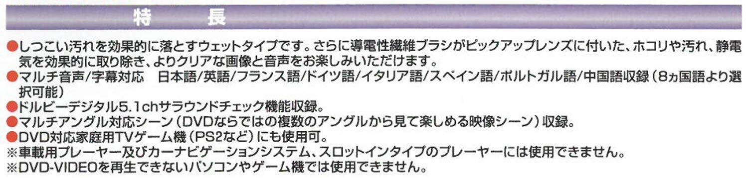 DVDピックアップレンズに付いたゴミやホコリを取り除く湿式クリーナーです。ドルビーデジタル5.1chサラウンドチェック機能収録。