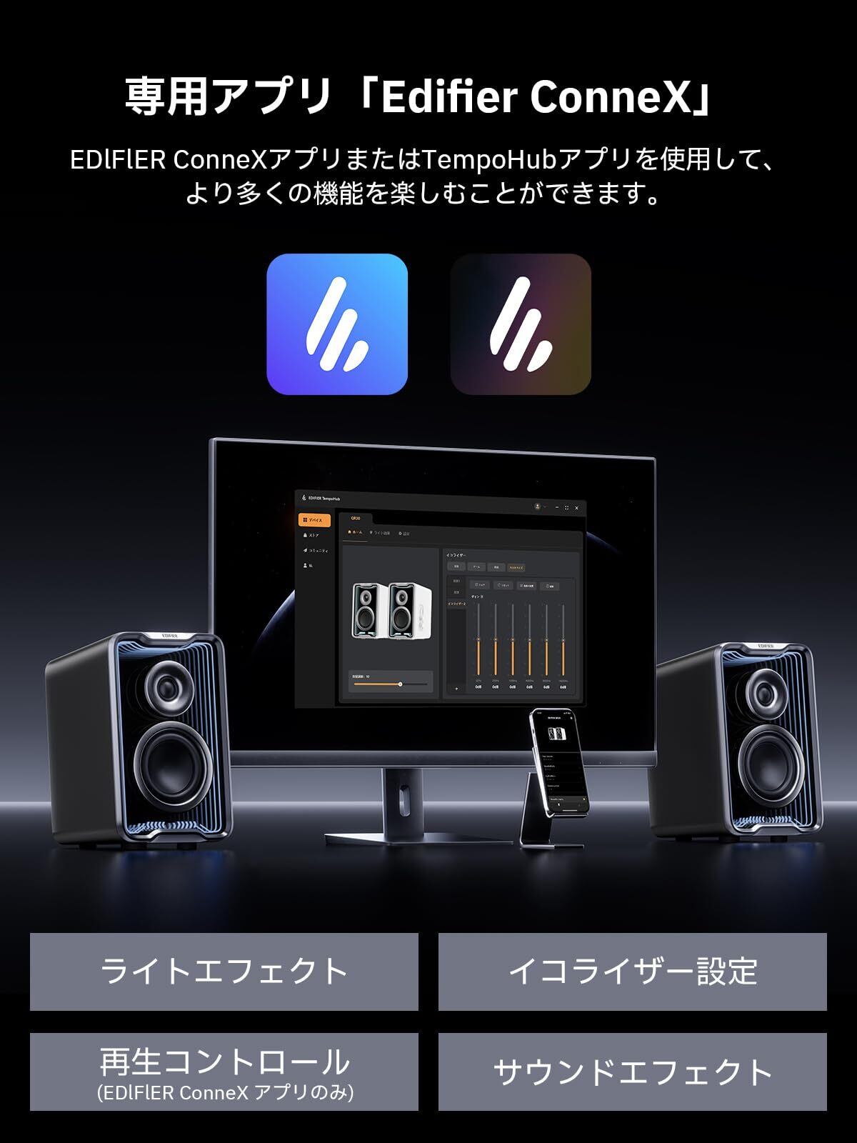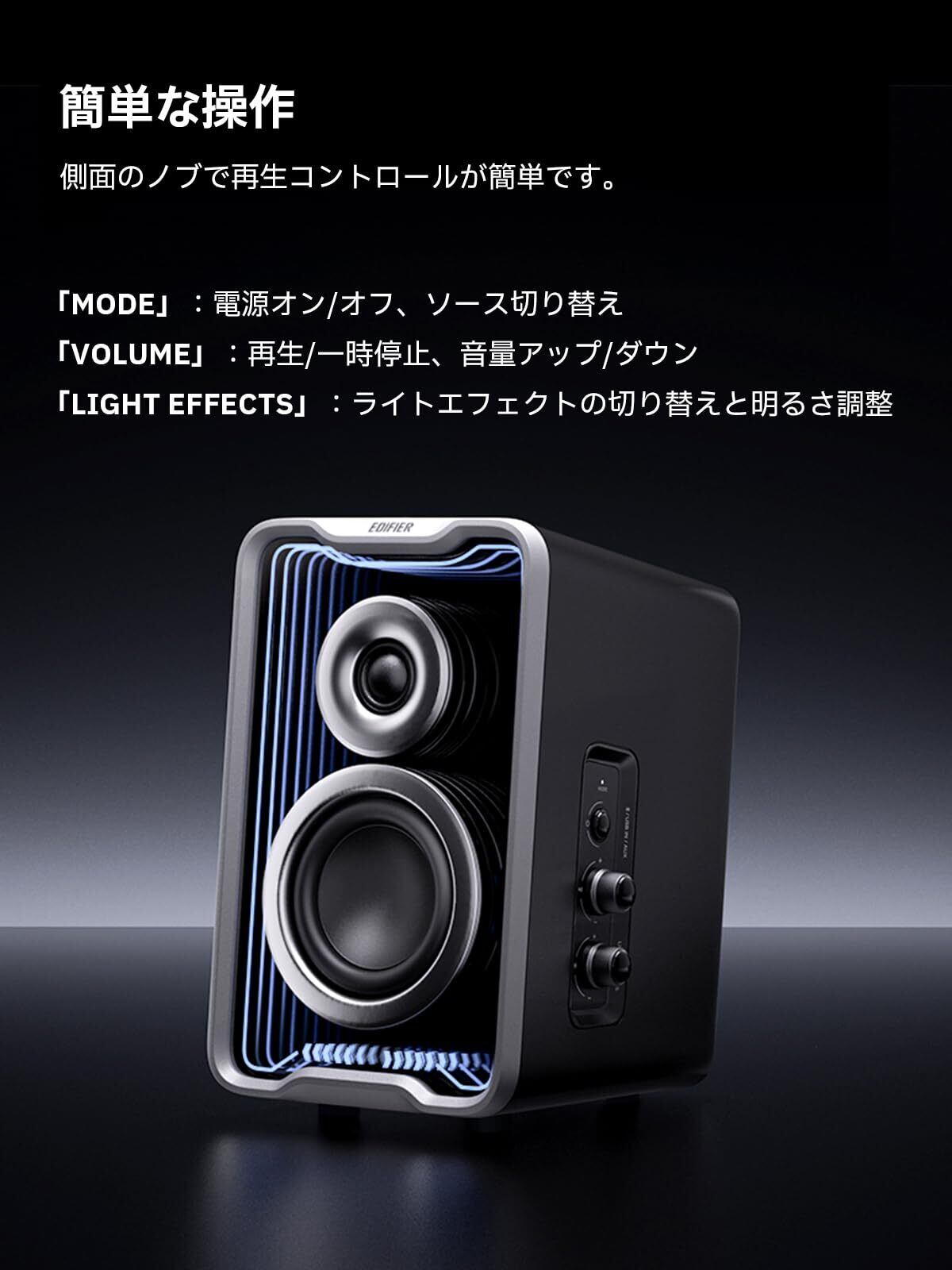 【コントロールが簡単】 QR30の側面にコントロールボタンを搭載します。また、EDIFIER ConneXモバイルアプリとEDIFIER TempoHub PCアプリにも対応し、 好みに合わせてサウンドや照明効果を簡単に切り替え、カスタマイズできます。
