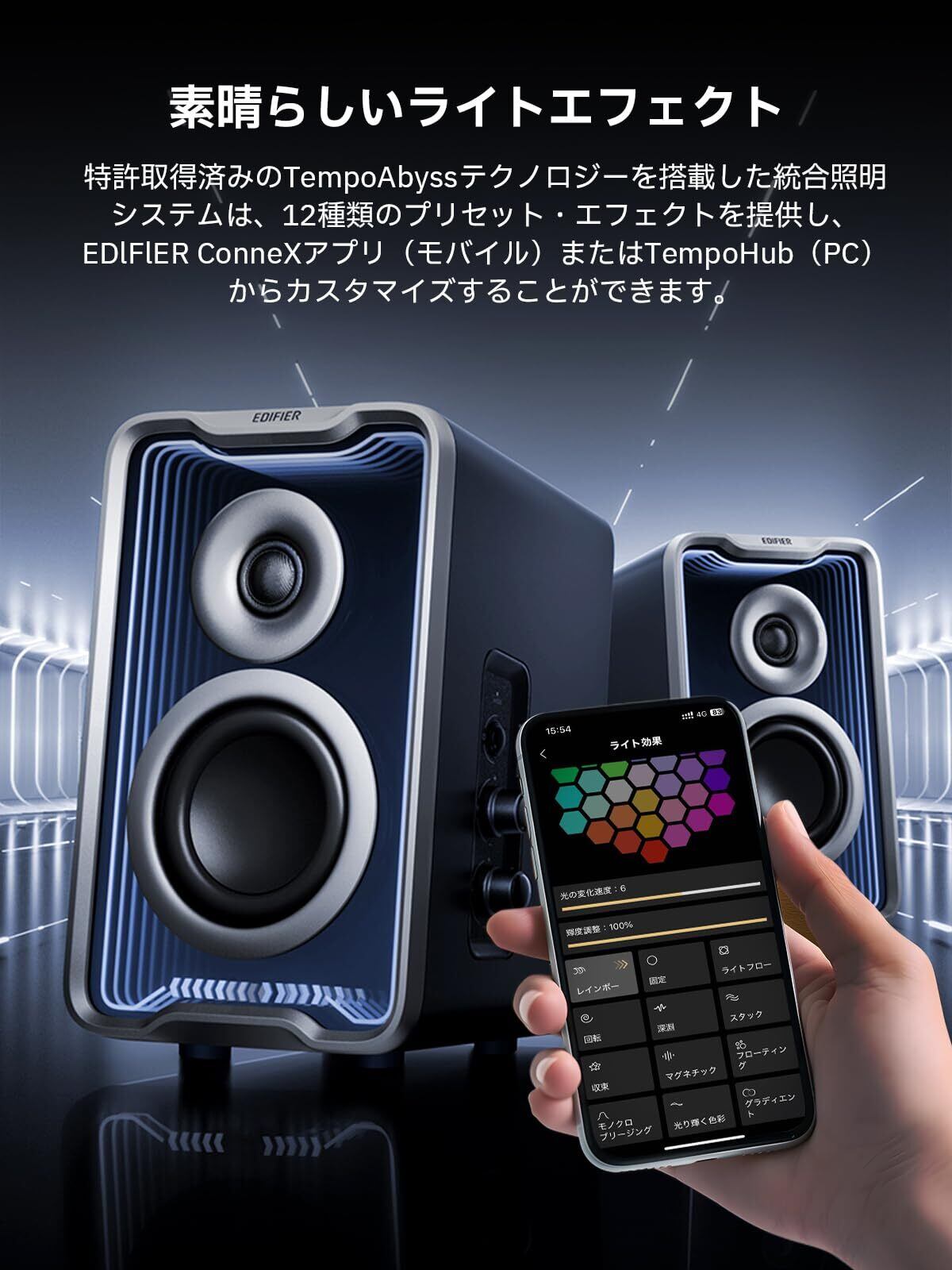 【華麗な光効果】取得済みの「TempoAbyss テクノロジー」を活用したライトエフェクトを搭載します。12種類のプリセットエフェクトを提供し、数百万色のライトカラーがカスタマイズ可能です。