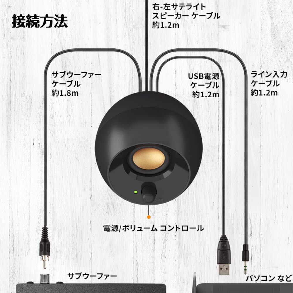 【サブウーファー付 3.5mmプラグケーブルモデル】PCのUSBポートや市販のUSB電源アダプターで給電が可能で、音声は手軽な3.5mmプラグケーブルを接続するだけの大人気、Creative Pebble譲りのデザインにコンパクトサイズでダウンファイアリングサブウーファーを追加したUSB給電コンパクト2.1chスピーカー