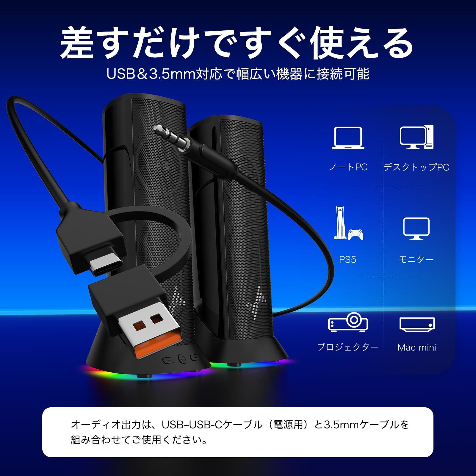 Nylavee PCスピーカー パソコン用 Hi-Fiステレオ 重低音強化 9種類LEDライト USB/Type-C給電 3.5mm有線接続 パソコンスピーカー デスクトップ/ノートPC/モニター/PS5/Xbox対応