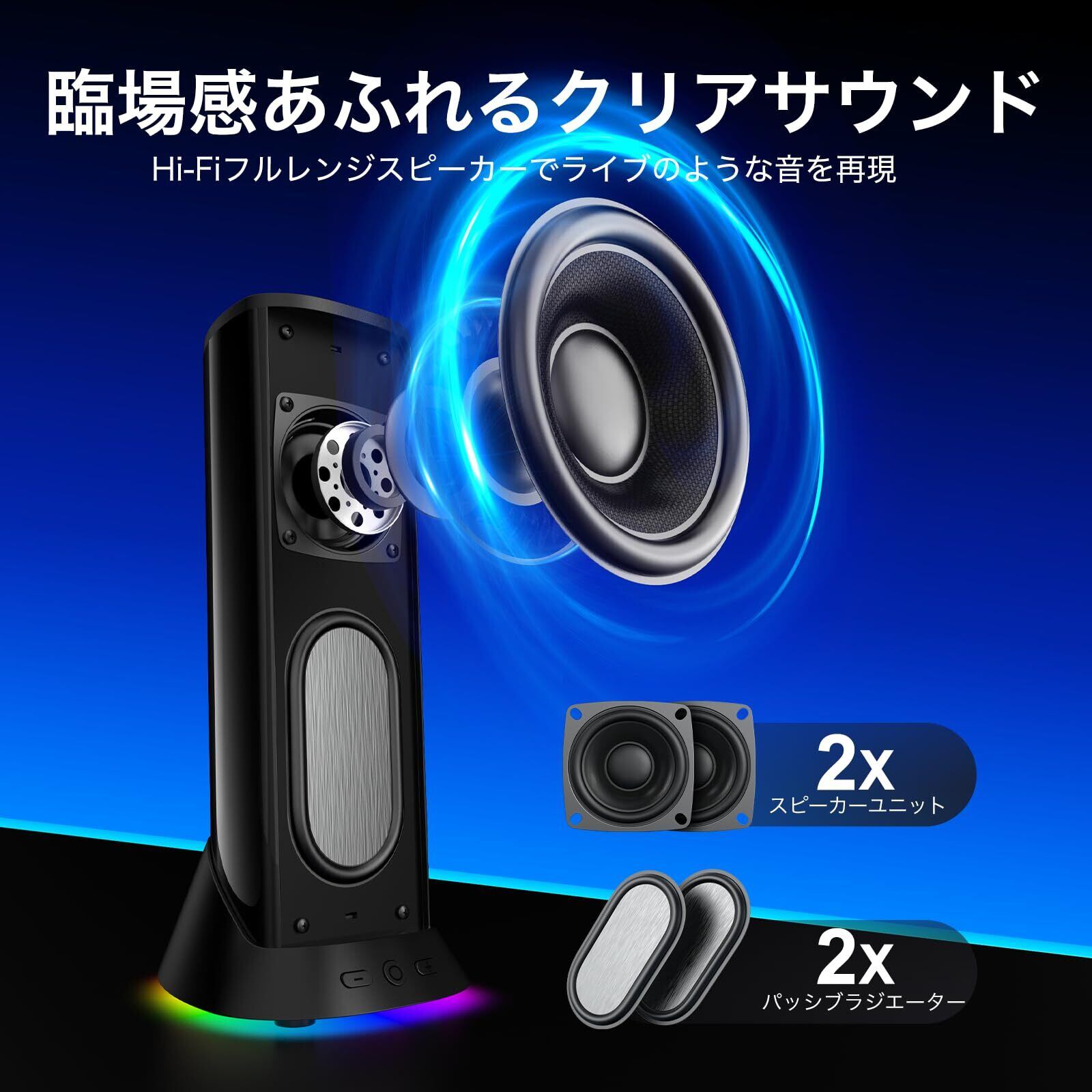 【迫力の重低音】特別設計パッシブラジエーター2基搭載。ビートに響く深みのある低音で音楽、映画、ゲームの臨場感アップ。デスクトップスピーカーでHi-Fi重低音体験。