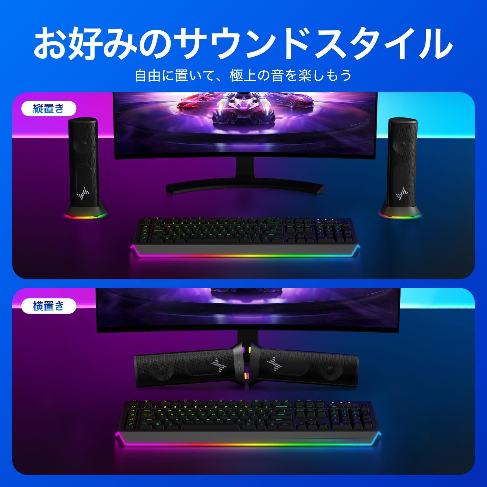 【多彩なライティング搭載】レインボー・ブレスなどの動的エフェクト+7色固定カラーでゲーミングPCスピーカー・デスクトップスピーカー環境をおしゃれに演出。モニター用スピーカーとしても最適。