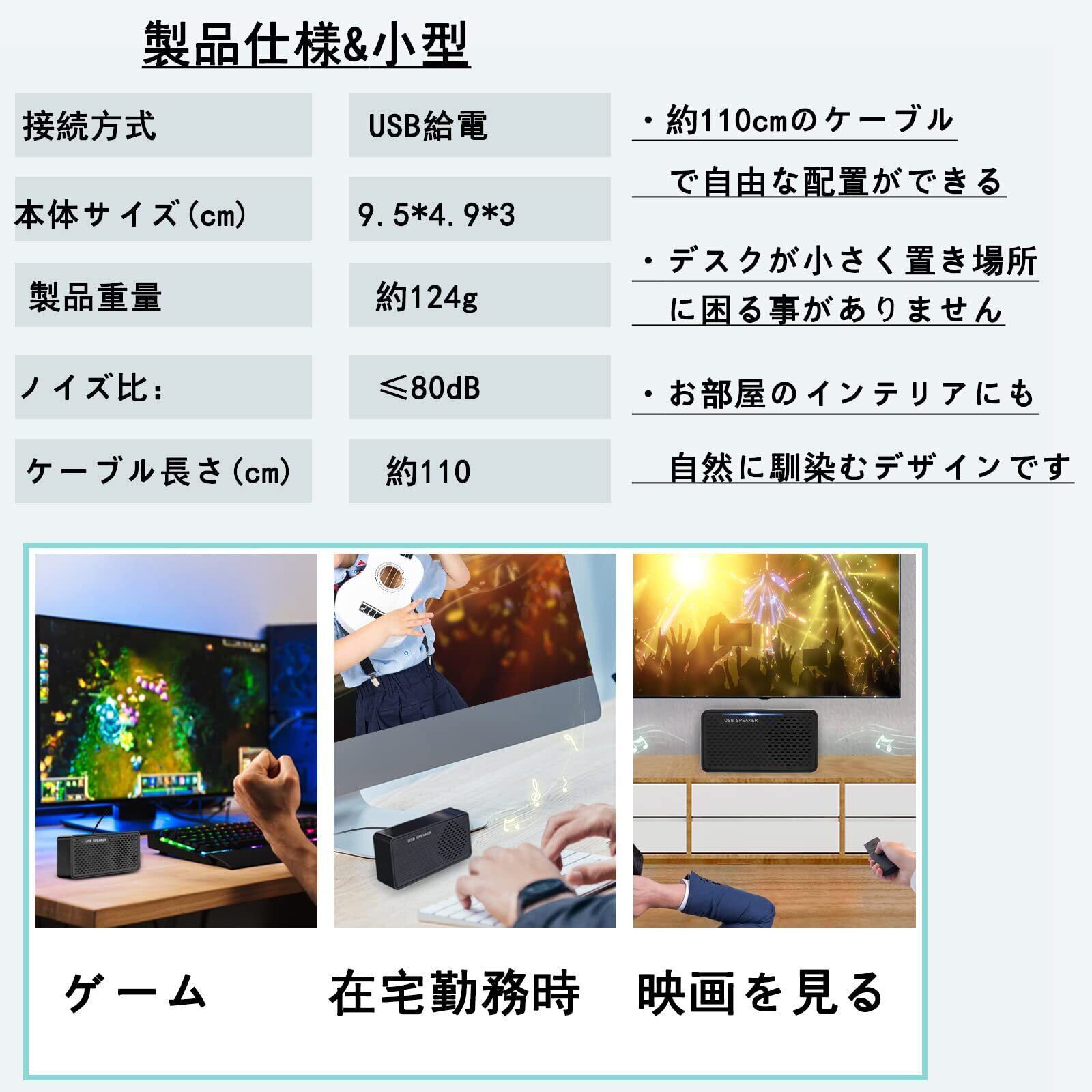 1.「なにも設定せず」3.5mmオーディオケーブルは必要がありません。USB端子はpcスピーカーに接続してボタンをクリックするだけでゲームや音楽を高音質で楽しめる。なにも設定が不要です。繋ぐ配線はパソコンのUSBで行えるためコンセントが不要で、パソコン周りの配線をスッキリさせられます。