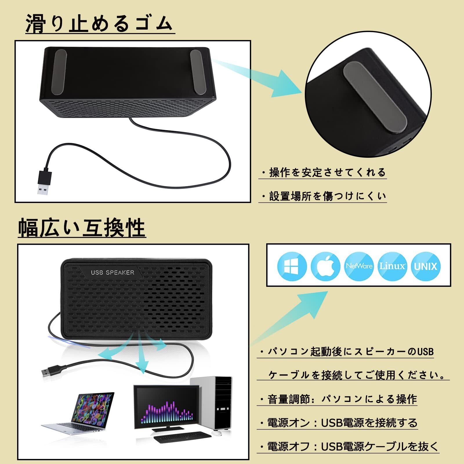 4.「幅広い互換性」さまざまなドライバーをダウンロードする必要はありません。Windows、Net Ware、Unix、Linux、Macなどと連続して使用することができます。スピーカーは黒を基調としたシンプルなデザインなので、インテリアとマッチしやすいのも魅力です。連続のケーブルは約110cmで自由な配置できます。