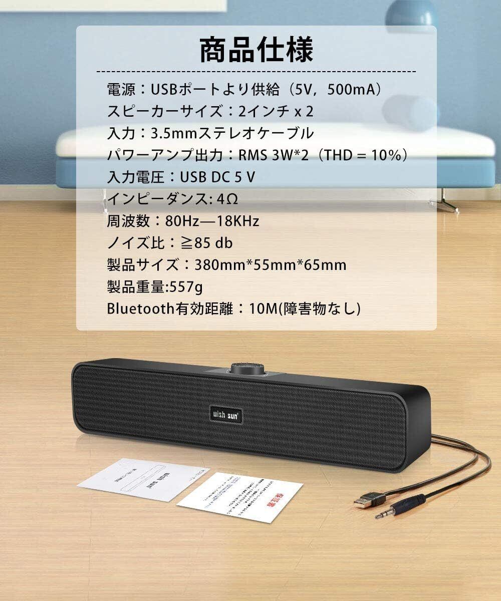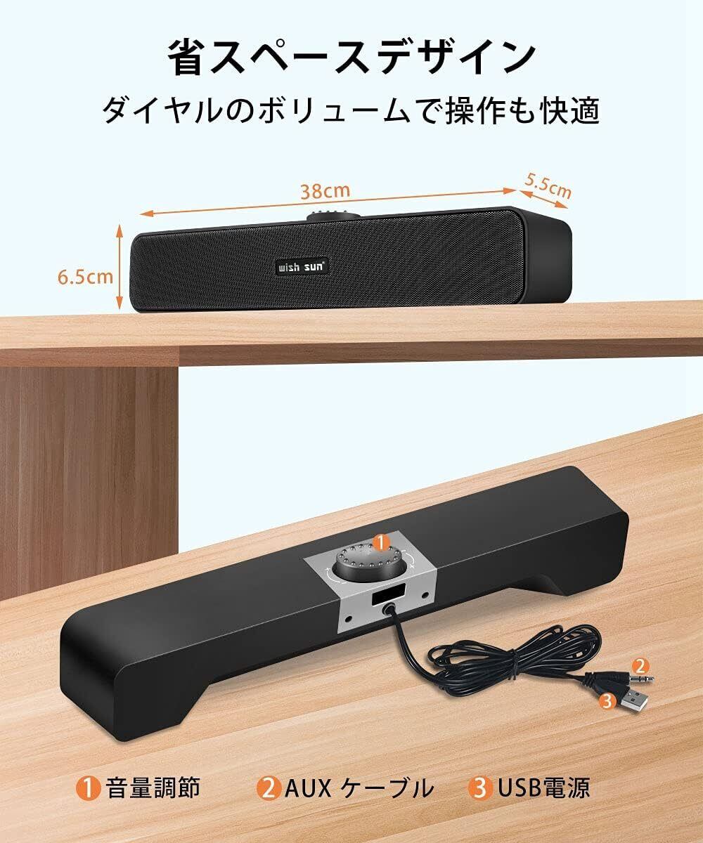 PCスピーカー 臨場感 wish sun PC スピーカー サウンドバー 臨場感 ブルートゥース ワイヤレススピーカー Bluetooth5.0 大音量 テレビ/パソコン/スマホ対応 コンパクト USB給電 AUX接続 長時間連続再生を実現 Bluetooth 5.0 小型テレビスピーカー 大音量 テレビ/パソコン/スマホ対応 AUX接続 USB給電
