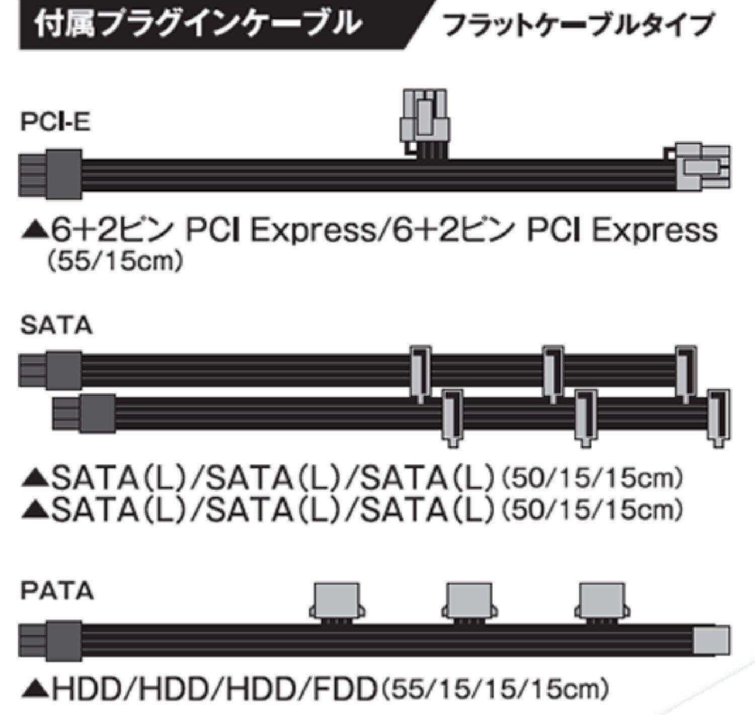 配線がキレイに仕上がる ブラックコネクタ&フラットケーブルを採用したプラグイン仕様。現在主流になっている電源下置きケースに最適なSATA電源コネクター配列のケーブルです。