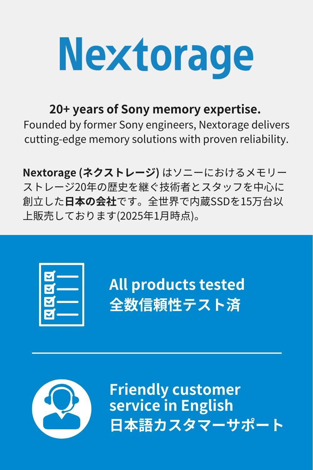 【ソニーの歴史を継ぐ日本メーカー】Nextorageはソニーにおけるメモリーストレージ20年の歴史を継ぐ技術者とスタッフを中心に創立した日本の会社です。全世界で内蔵SSDを15万台以上販売しております(2025年1月時点)