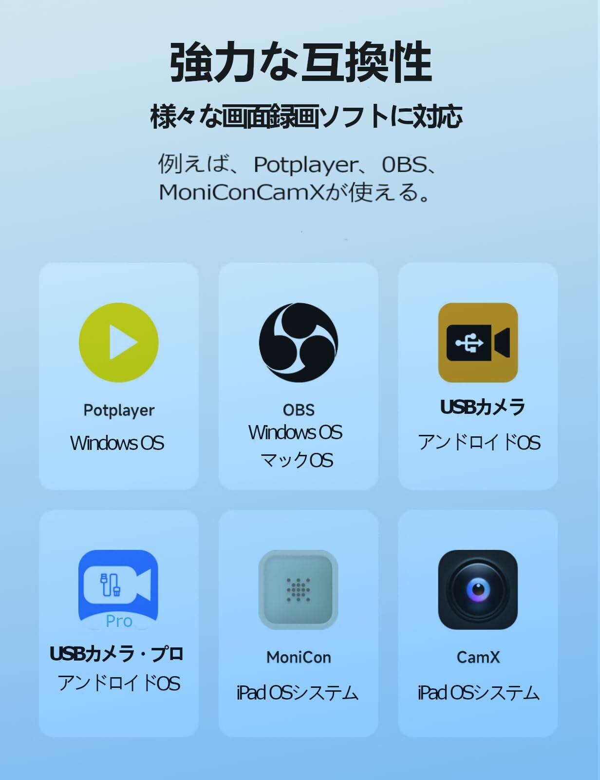 【1080P高画質出力対応】本製品は4Kパススルーに対応しておりますが、録画解像度は最大1080pです、テレビやHDMIモニターで高解像度映像を楽しむことができます。生放送、ゲーム録画、動画編集、画像同期に理想的な性能を提供。OBSの設定ガイド付きで、フレームレートや解像度のカスタマイズも可能。設定後、ソフトウェアの再起動をおすすめします。