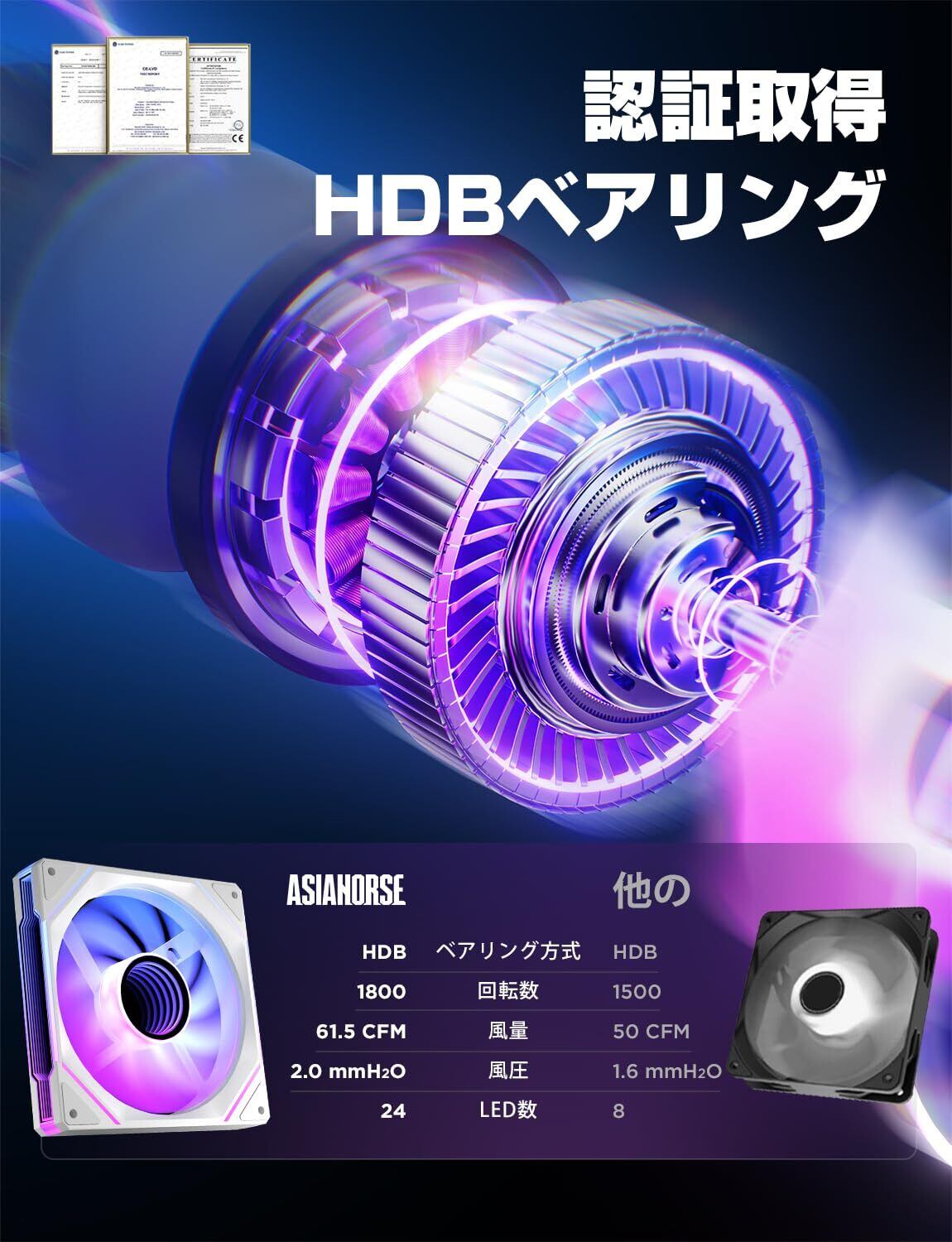 [超高性能HDB]:このASIAHORSE AMICI PCケースファンは、従来のHDBベアリングやオイルシールベアリングとは異なり、高性能のハイドロダイナミックベアリング(HDB)を採用しています。このベアリングは潤滑油で満たされ、ベアリングの軸とスリーブの間にはオイルフィルムがあり、直接の金属摩擦とオイルの蒸発を減少させ、全体の潤滑を確保し、摩耗を大幅に低減して運転効率を向上させます。これにより、よりスムーズで静音なPCファン動作が可能となり、ケースファン 120MMの寿命が大幅に延びます。