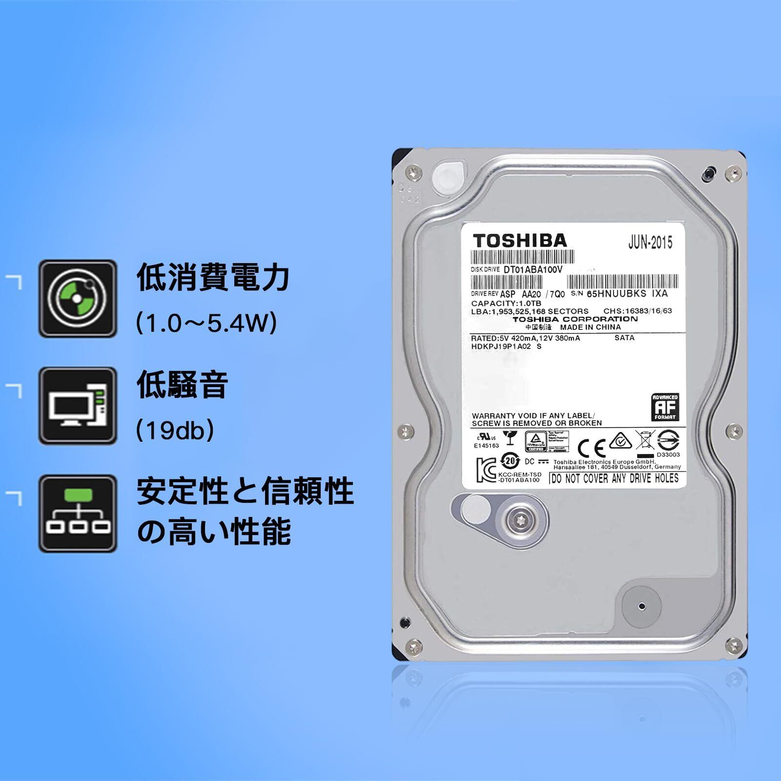 【整備済み品】 東芝 HDD 1TB, 3.5インチ 内蔵 ハードディスク SATA 6Gb/s 5700rpm 32MB キャッシュ, ビデオ編集、DVR、NVRアプリケーション向け、DT01ABA100V、間の
