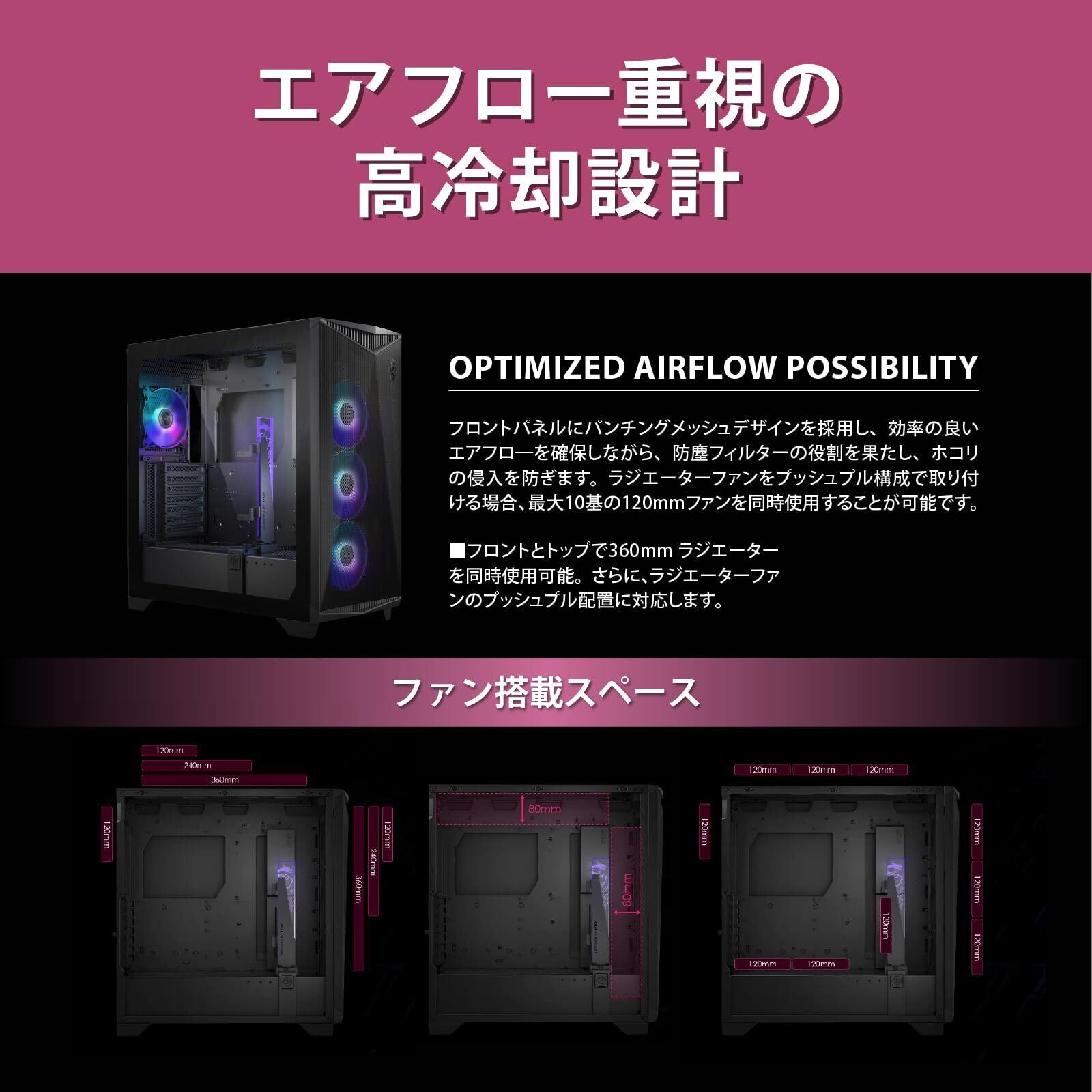 各所にメッシュ構造を採用した高エアフロー設計に4基のARGBファンを標準搭載したEATX PCケース。大型ラジエーター搭載が可能な余裕のあるスペースを備え、高い冷却性能を発揮します。