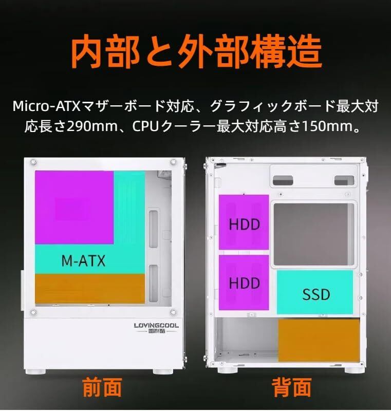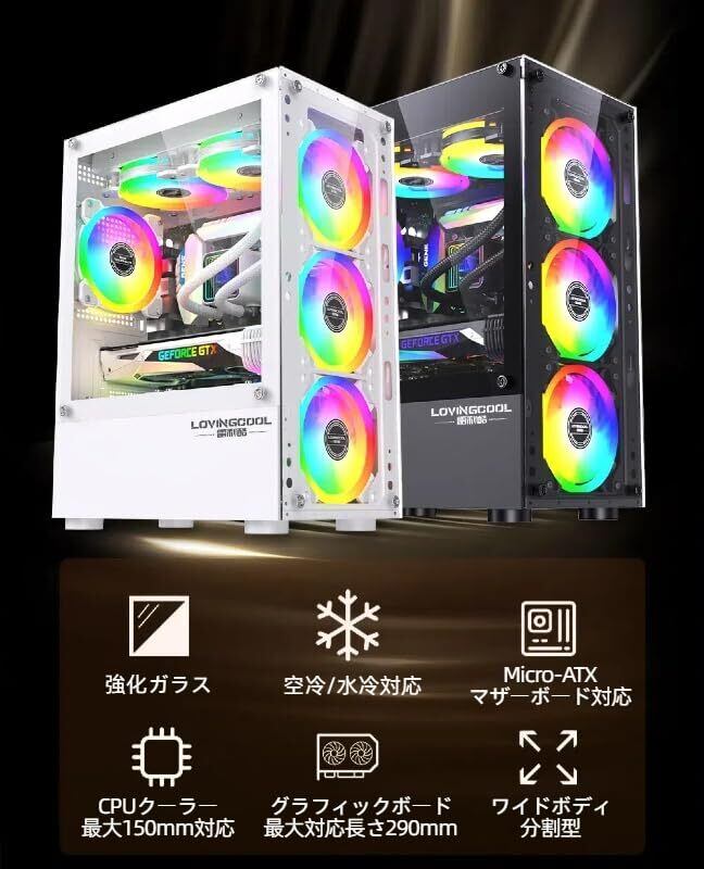 全景強化ガラスを採用したスタイリッシュなミドルタワー型PCケース。Micro-ATXマザーボードに対応し、最大150mmのCPUクーラーと290mmのグラフィックボードを搭載可能。幅広な分体式設計により、優れた放熱性能とメンテナンス性を実現。3方向からのエアフロー設計(側面吸気+上面排気+前面冷却)により、高負荷時でも安定した冷却環境を提供します。 工具不要の三面クイックリリース構造(トップ・フロント・両サイド)を採用し、内部パーツの組み立てや清掃もスムーズ。上部にはマルチI/Oパネルを配置し、日常使いやゲーミングにも便利な豊富なインターフェースを備えています。スタイリッシュで高機能なハードウェアケースとして、自作PC初心者から上級者まで幅広くおすすめできる一台です。
