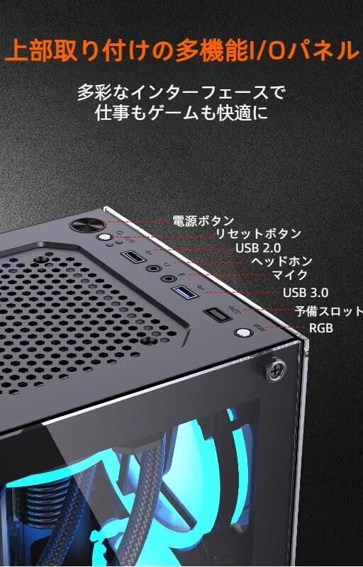 【多機能I/Oパネルを上部に搭載】USBポートやオーディオ端子、電源ボタンなどをケース上部に配置し、アクセス性抜群。デスクの下に設置してもスムーズに操作可能で、オフィス・ゲーミングどちらの用途にも対応します。