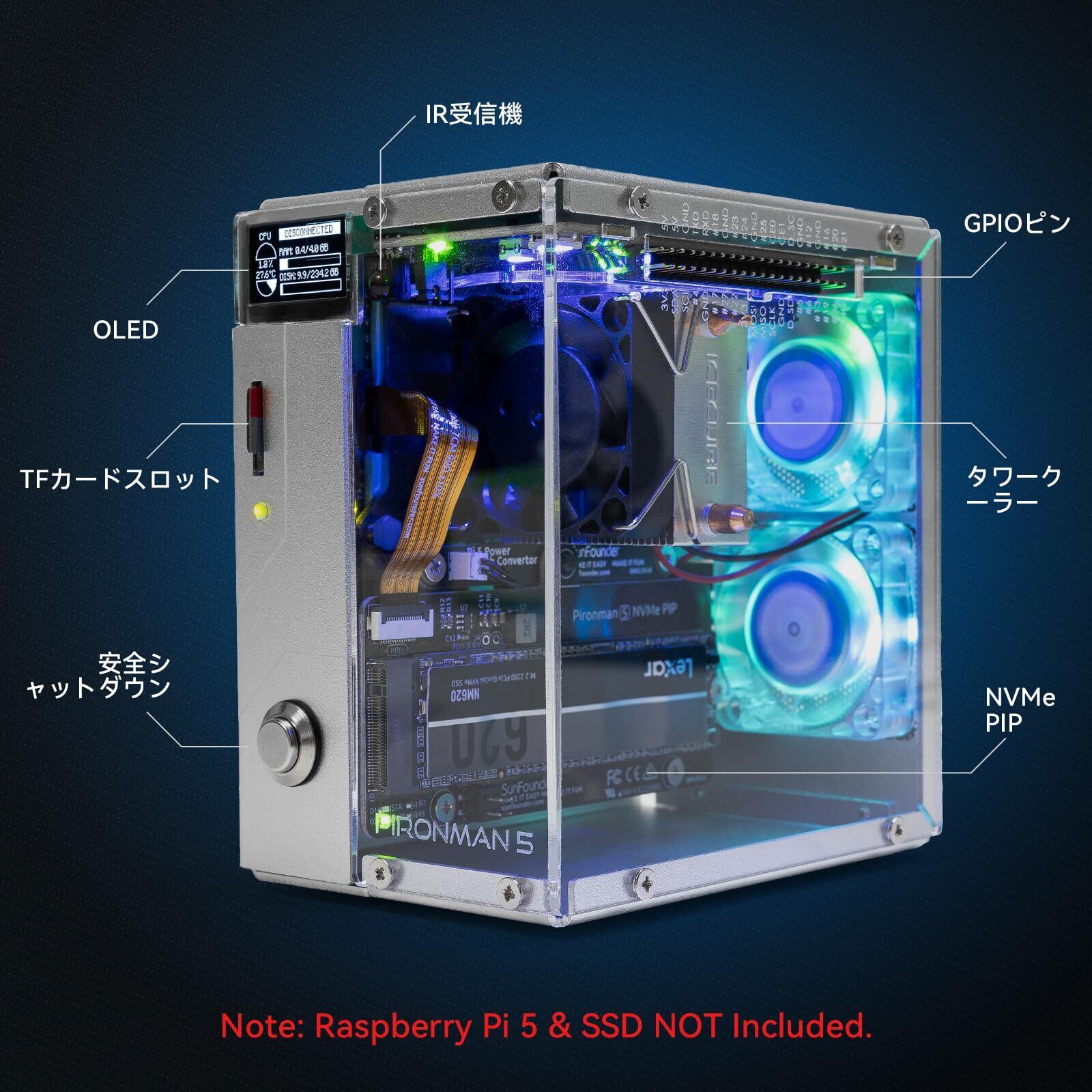 Raspberry Pi 5 用 Pironman 5 NVMe M.2 SSD PCIe ミニ PC ケース Hailo-8L AI アクセラレーター搭載 タワークーラー+デュアル RGB ファン、0.96インチ OLED モジュール、安全シャットダウン、標準 HDMI、RGB エフェクト、スタイリッシュデザイン、オンラインチュートリアル(日本語)