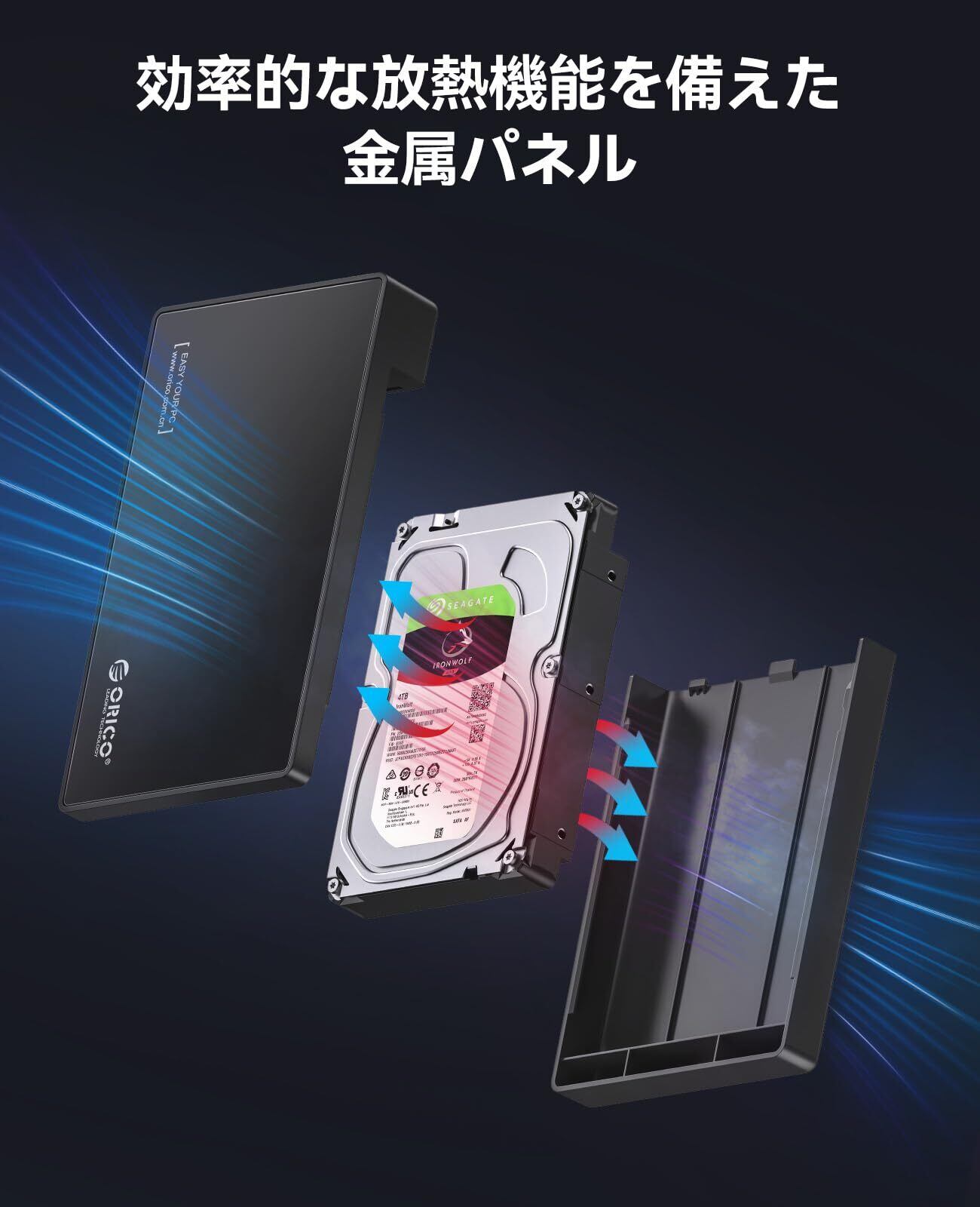 【安全保護】金属製パネルにより、優れた放熱性と耐圧性を持っています。外付けhdd ケースの内部に絶縁膜付、静電気による損傷を軽減し、データを保護させます。