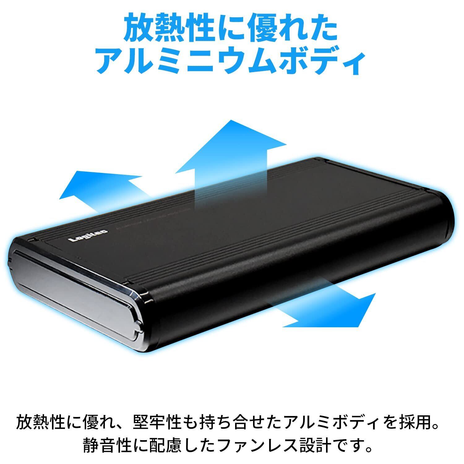 【アルミボディ採用】高い熱伝導性による放熱性に優れたアルミボディで内蔵ハードディスクを熱から守ります。また、ファンレス構造で静音性を実現。パソコンやテレビの近くに置いても音が気になりません。