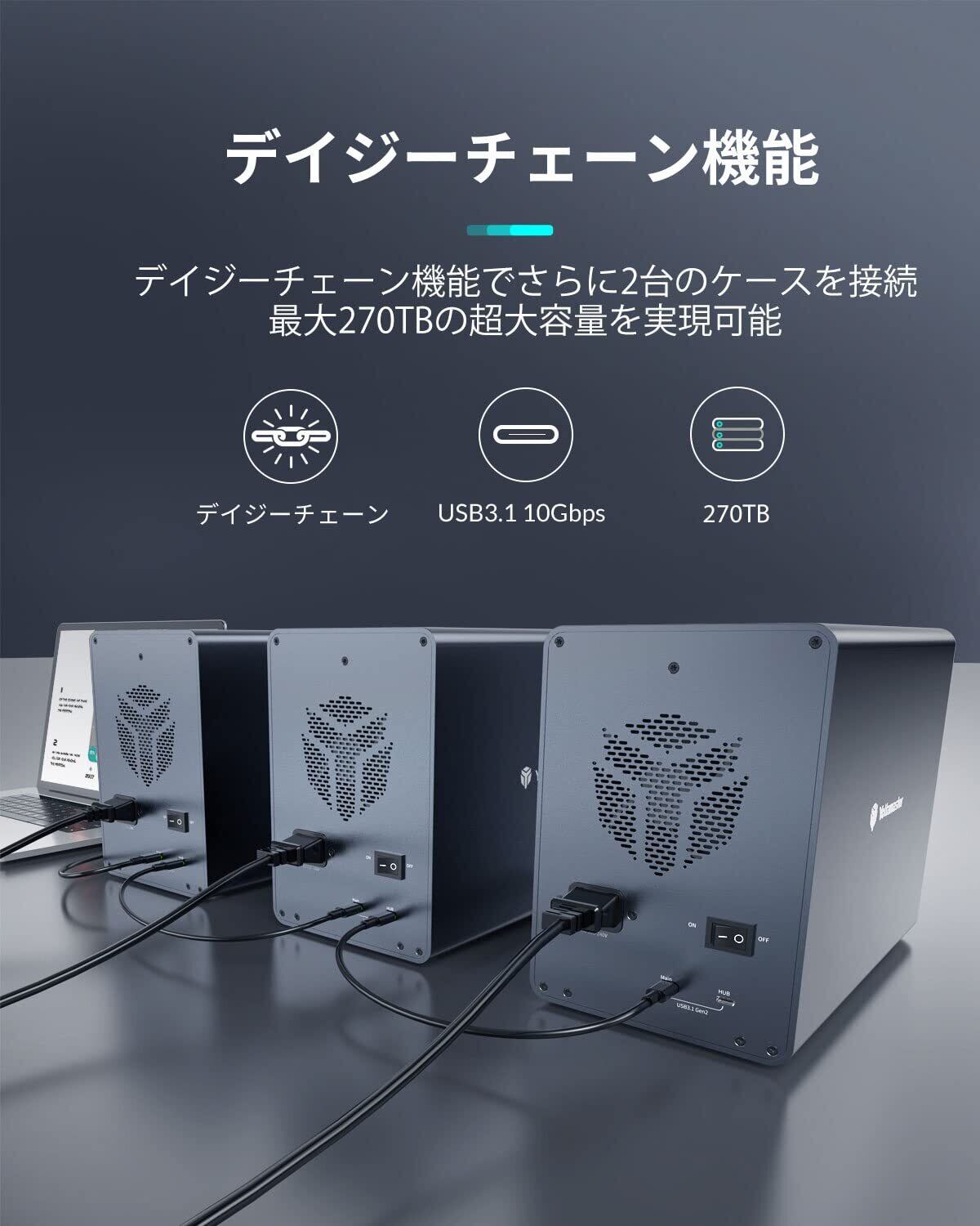 【中小企業向け大容量ストレージ】デイジーチェーン機能搭載した5ベイ外付け3.5インチHDDケースです。18TBまでのハードディスクを5台搭載可能、最大で90TBの超大容量を使用することができます。デイジーチェーン機能を利用して、2つの[FS5C3]デバイスを追加可能、最大総容量は驚きほどの270TBになるので、膨大なの会社資料やデータの保存と管理がストレスなく行えます。3.5型/2.5型SATA接続のハードディスク全対応、Windows/MAC OS /Linux多数OSに対応します。