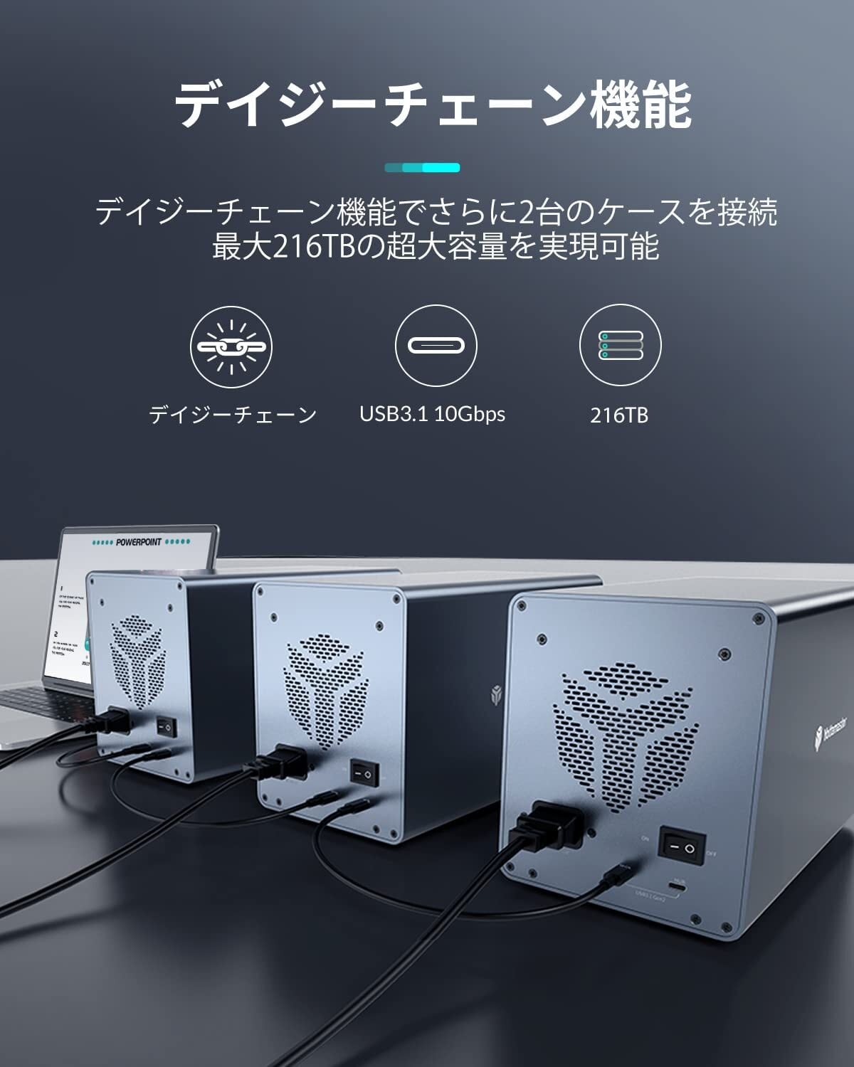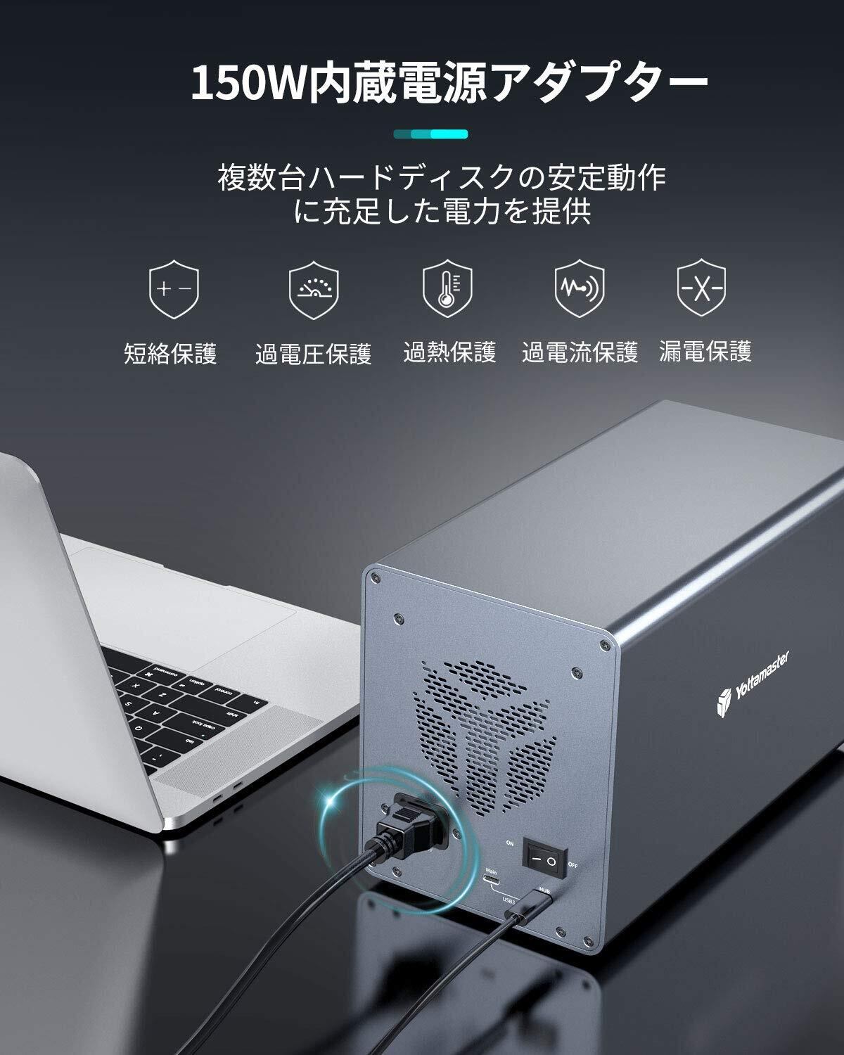 【澎湃な電力パワー】150Wハイパワー内蔵電源アダプターを搭載、複数のハードディスクの動作に充足なパワーを提供します。ドライバー不要で、電源コードとUSBケーブルを接続するだけで利用可能ですので、デスクがスッキリと配線できます。