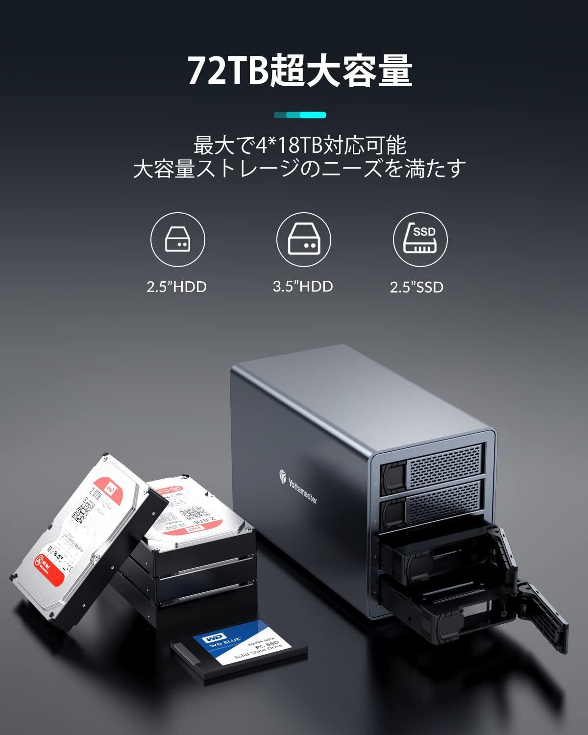 【中小企業向け大容量ストレージ】デイジーチェーン機能搭載した4ベイ外付け3.5インチHDDケースです。18TBまでのハードディスクを4台搭載可能、最大で72TBの超大容量を使用することができます。デイジーチェーン機能を利用して、2つの[FS4C3]デバイスを追加可能、最大総容量は驚きほどの216TBになるので、膨大なの会社資料やデータの保存と管理がストレスなく行えます。3.5型/2.5型SATA接続のハードディスク全対応、Windows/MAC OS /Linux多数OSに対応します。