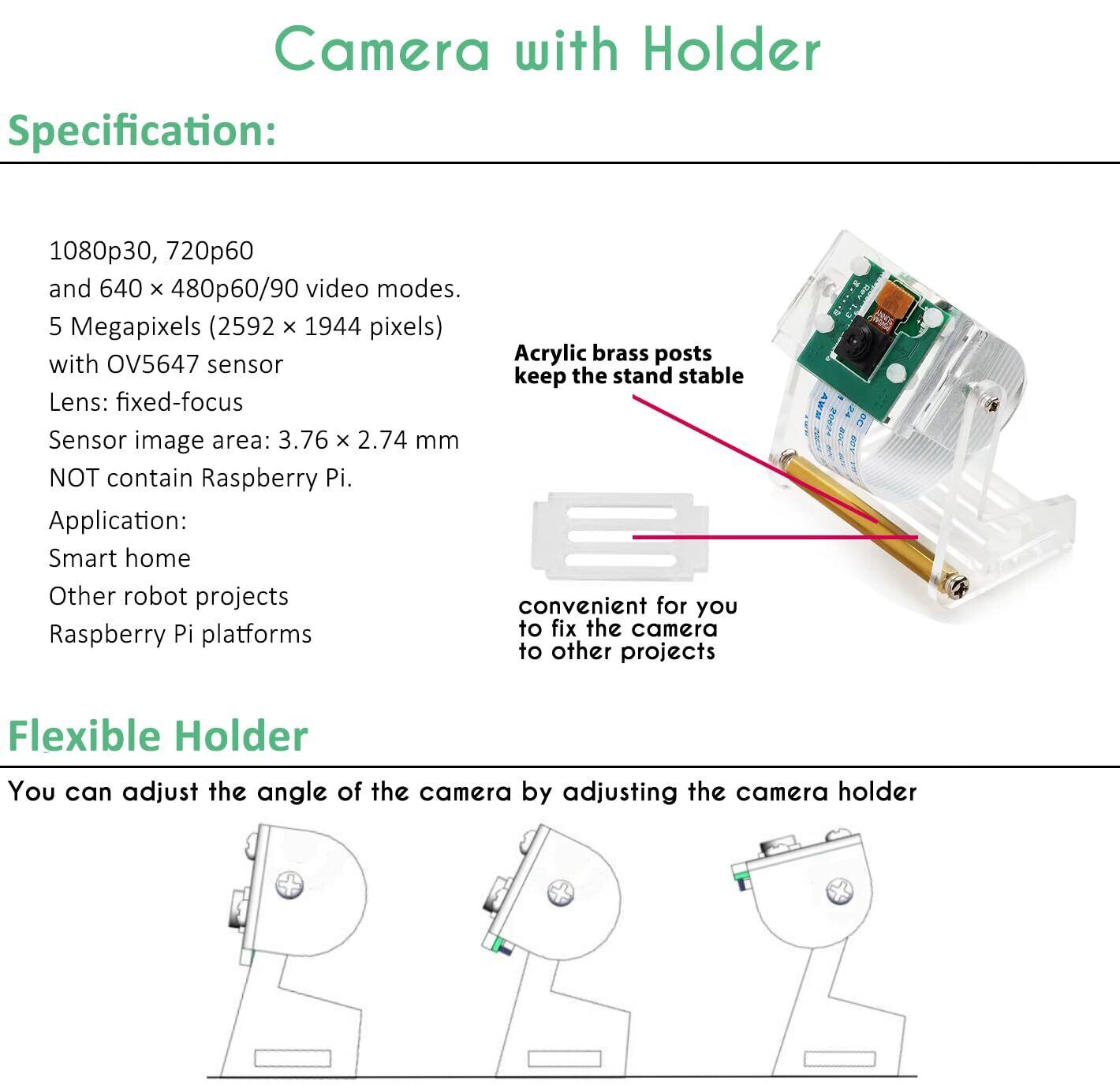 5MP カメラモジュール Raspberry Pi 4 Model B, Pi 3 b+, Pi Zero W 1080P ビデオカメラ用 調節可能なホルダーとフレックスケーブル付き OV5647センサー