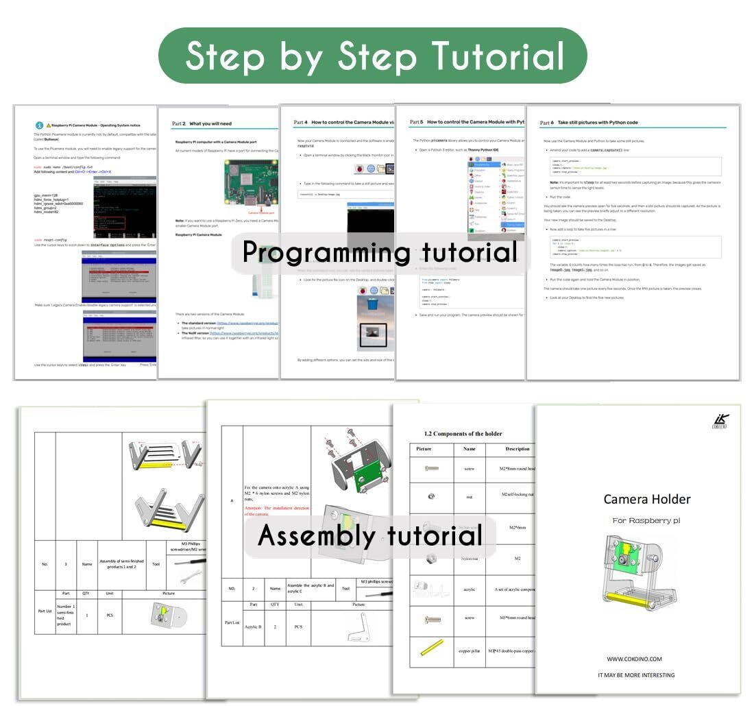 カメラホルダーを組み立て、このカメラをラズベリーパイで使用する方法をガイドするステップバイステップのチュートリアルを提供します