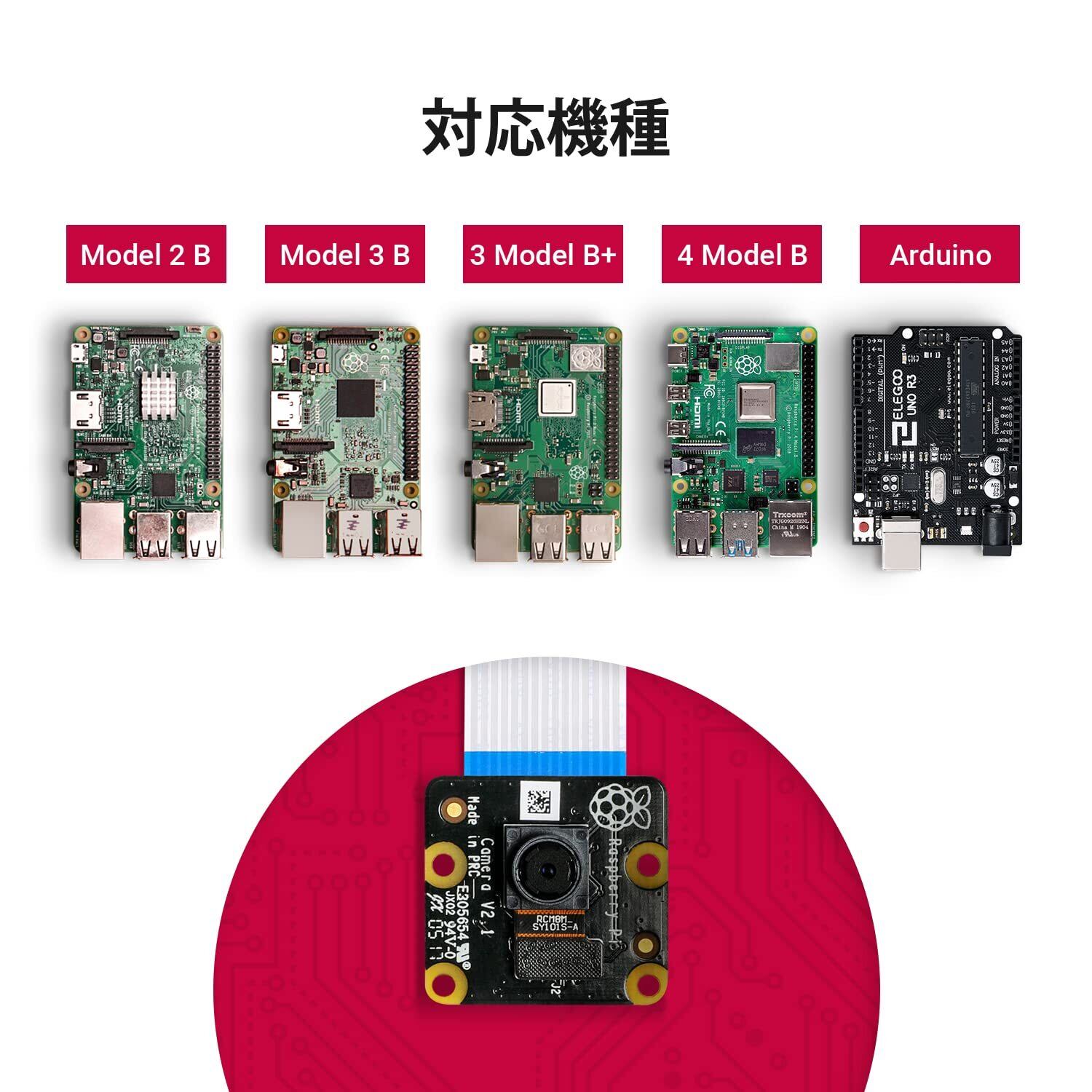 ▲【幅広い互換性】カメラモジュールはPi4B、3B+、3B+、3B、2Bと互換性があります。Raspberryだけではなく、他のCSIコネクタ付きボードにもサポート出来ます