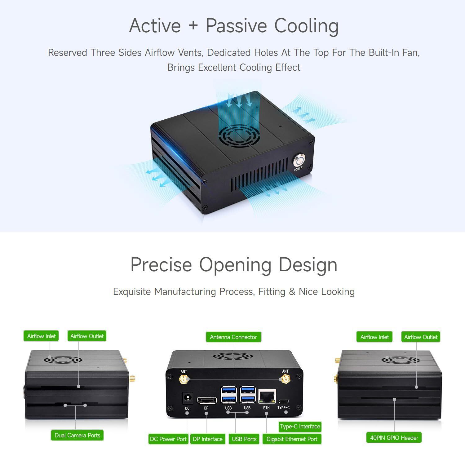 3 つの側面通気口、上部に内蔵ファン用の専用穴があります。 優れた冷却効果をもたらします。