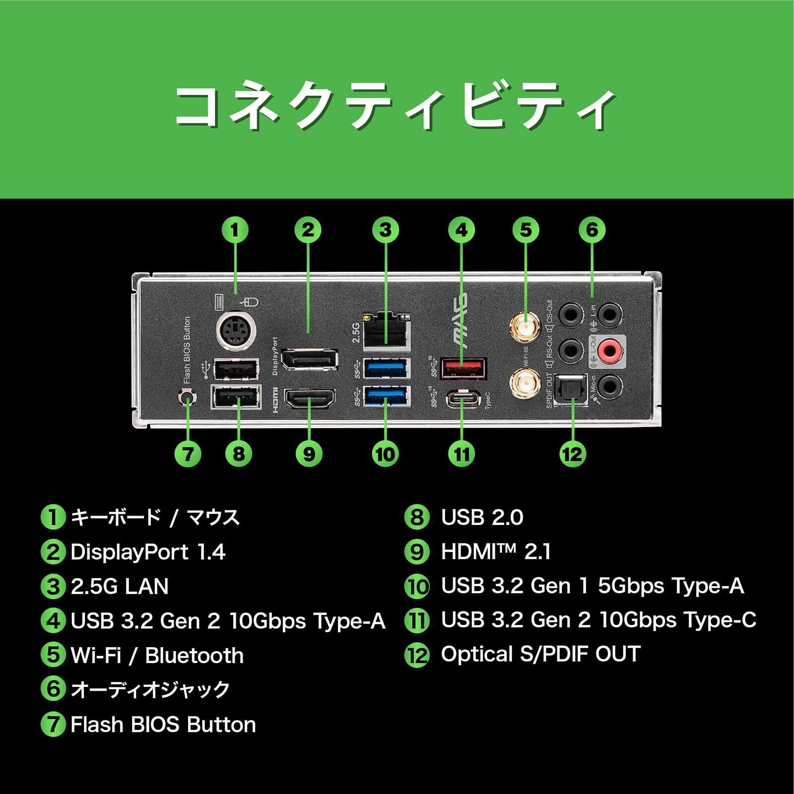 有線に2.5GbE LANポートを搭載、ワイヤレスはWiFi 6EとBluetooth 5.3に対応、いずれも高速ネットワーク接続が可能です。USBポートもUSB3.2 Gen2 Type-C・Type-Aポートを搭載しています。