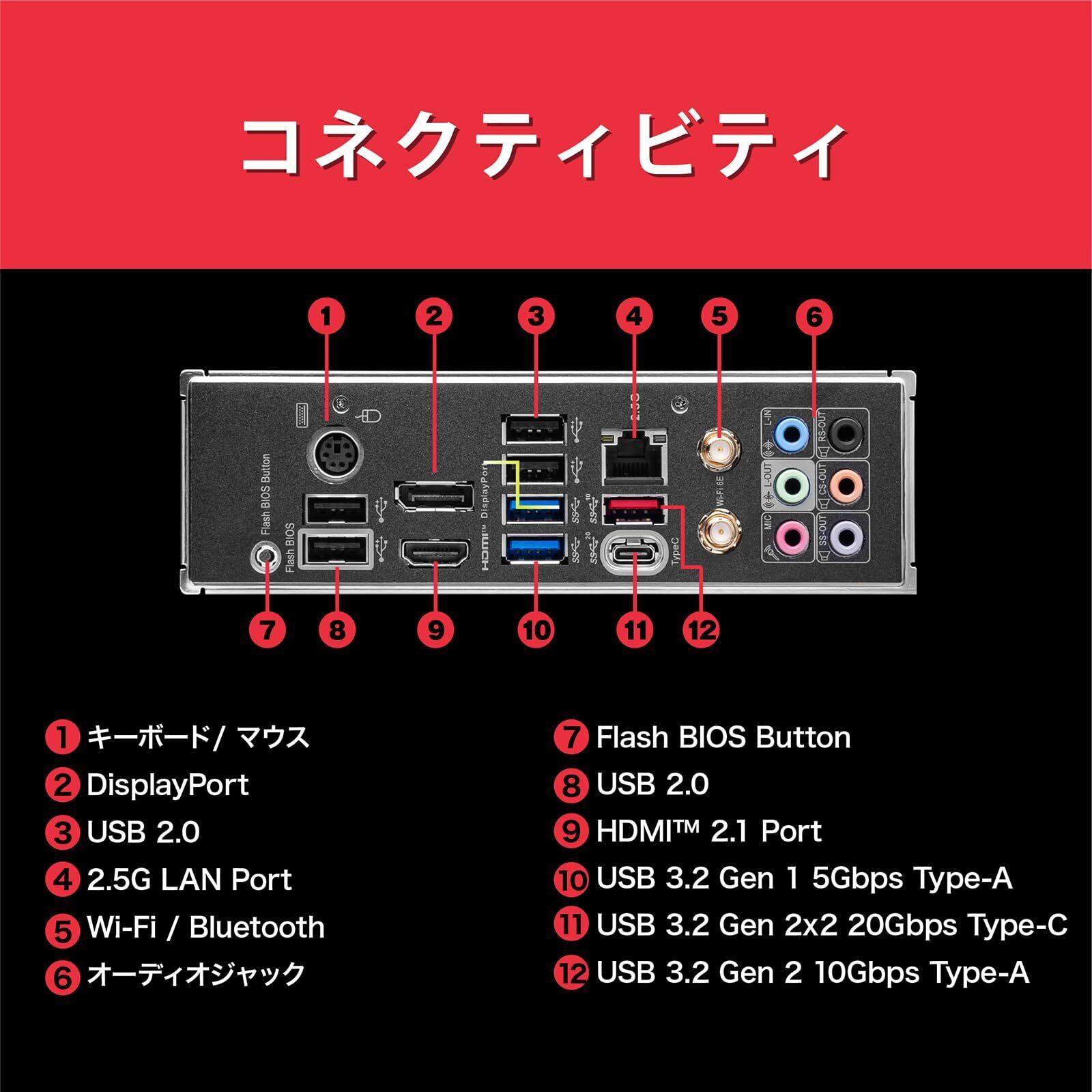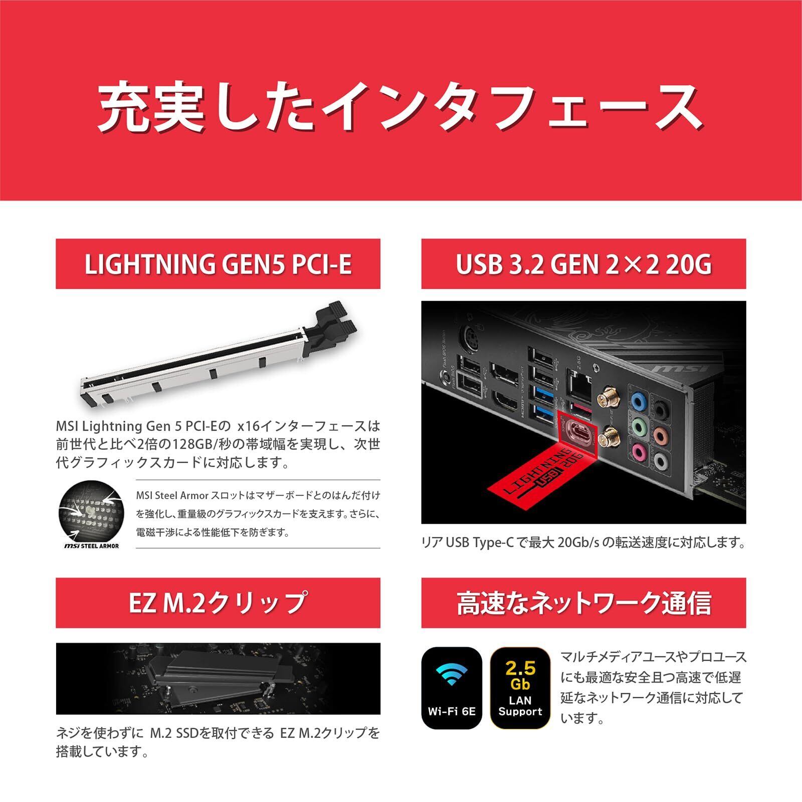 PCIE 5.0メインスロットをはじめ、USB3.2 Gen2x2・20Gbps転送対応のUSB Type-Cスロットを搭載、ネットワークもintel製2.5G 有線LANやWiFi 6Eをサポートしており、PC内部・外部ともに高速データ転送が可能です。