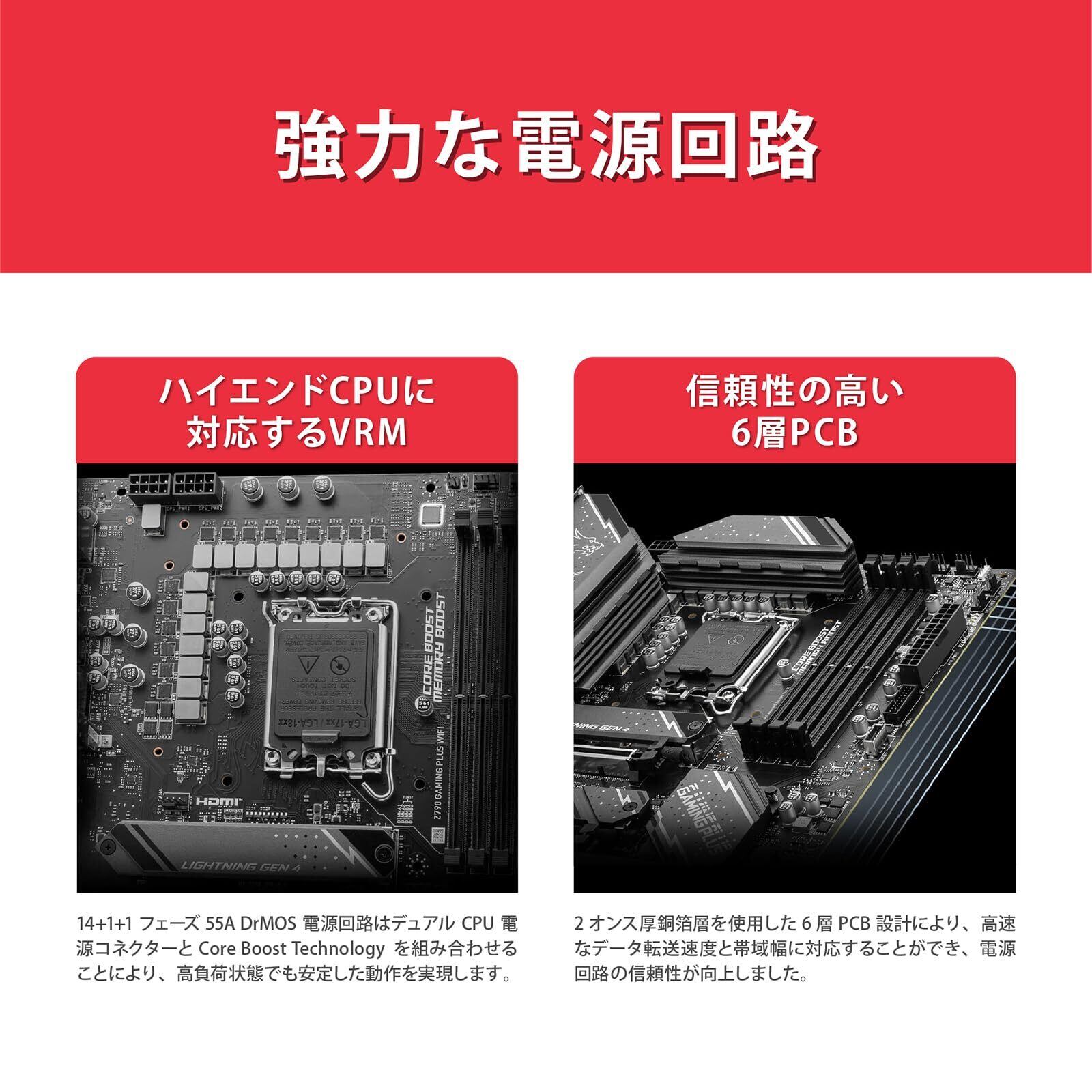 14+1+1 DrMOS電源フェーズに加え、VRM・M.2・チップセット部に大型のヒートシンクを搭載、高クロックCPUや高速M.2のポテンシャルを最大限に引き出すことが可能です。