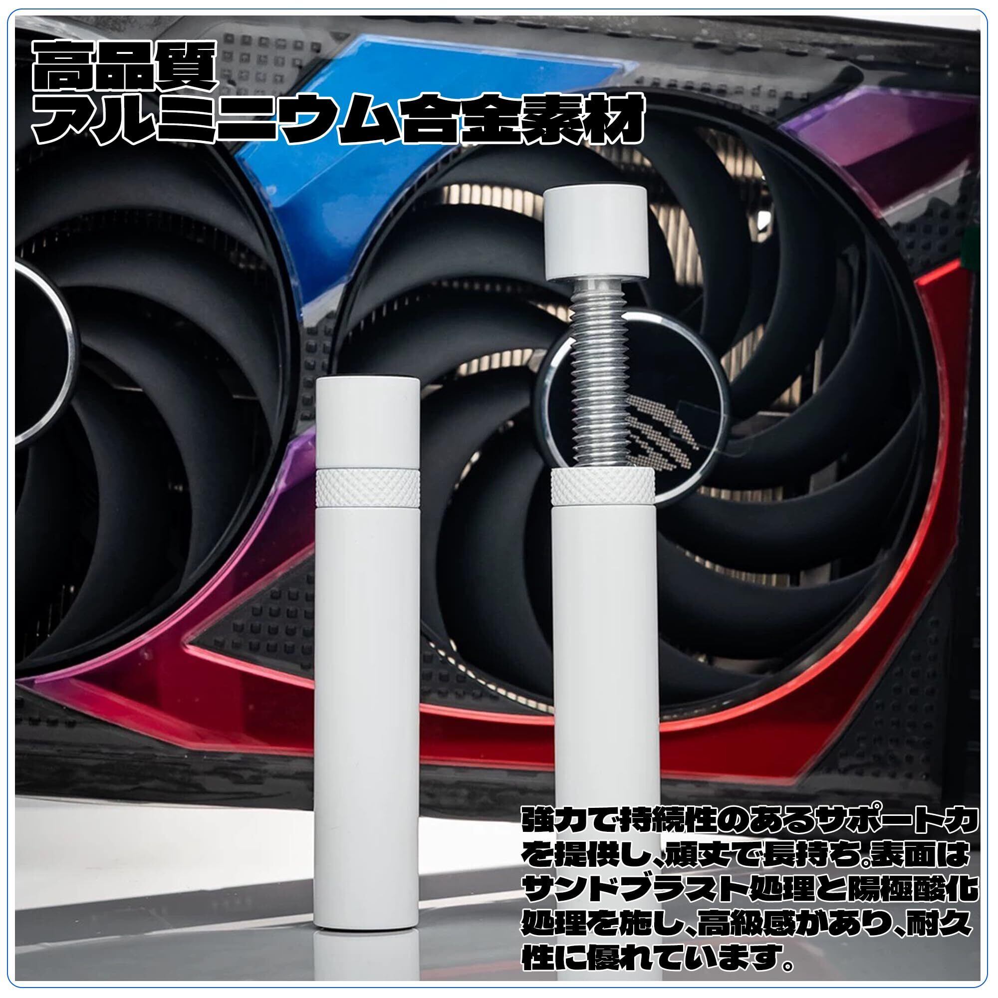【簡単な取り付け方法】お客様は、工具なしで簡単に取り付け可能です。 付属のネジを回すだけで、グラボの高さを自由に調整できます。 グラボ ステー 白 底部には衝撃吸収パッドと滑り止めベースが付いているため、PCケースに安定して固定されます。 また、取り付け時にグラボを傷つける心配はありません。